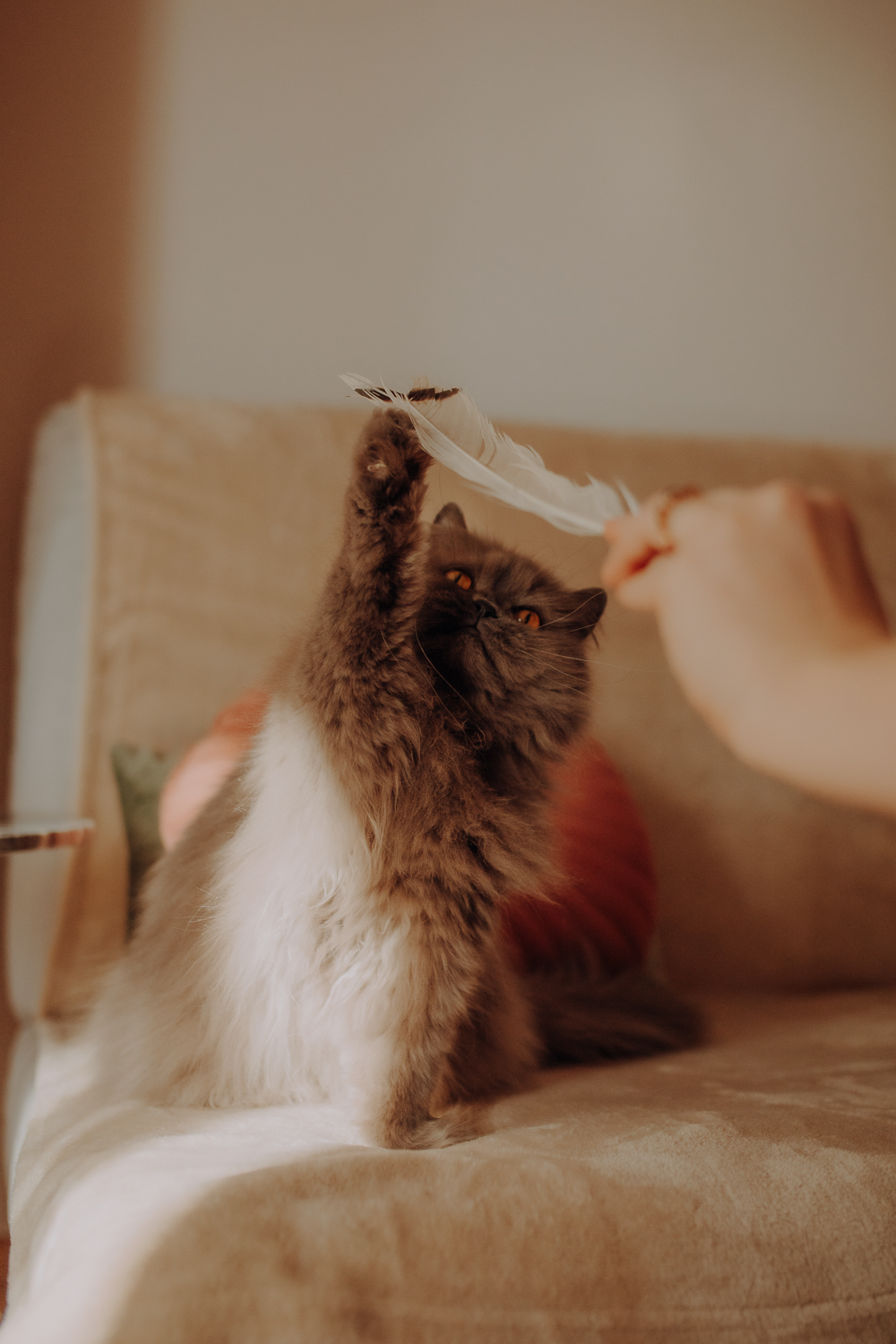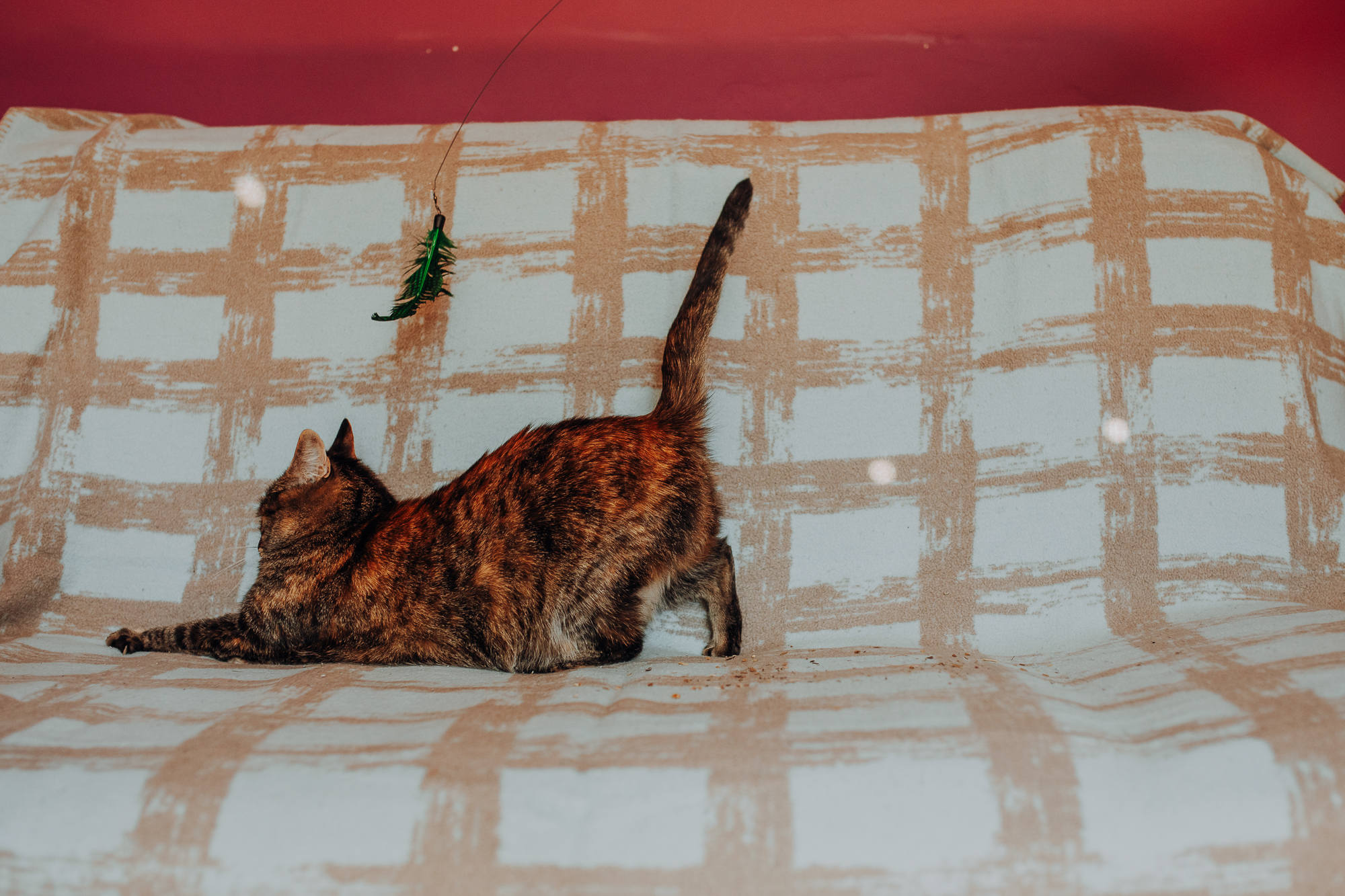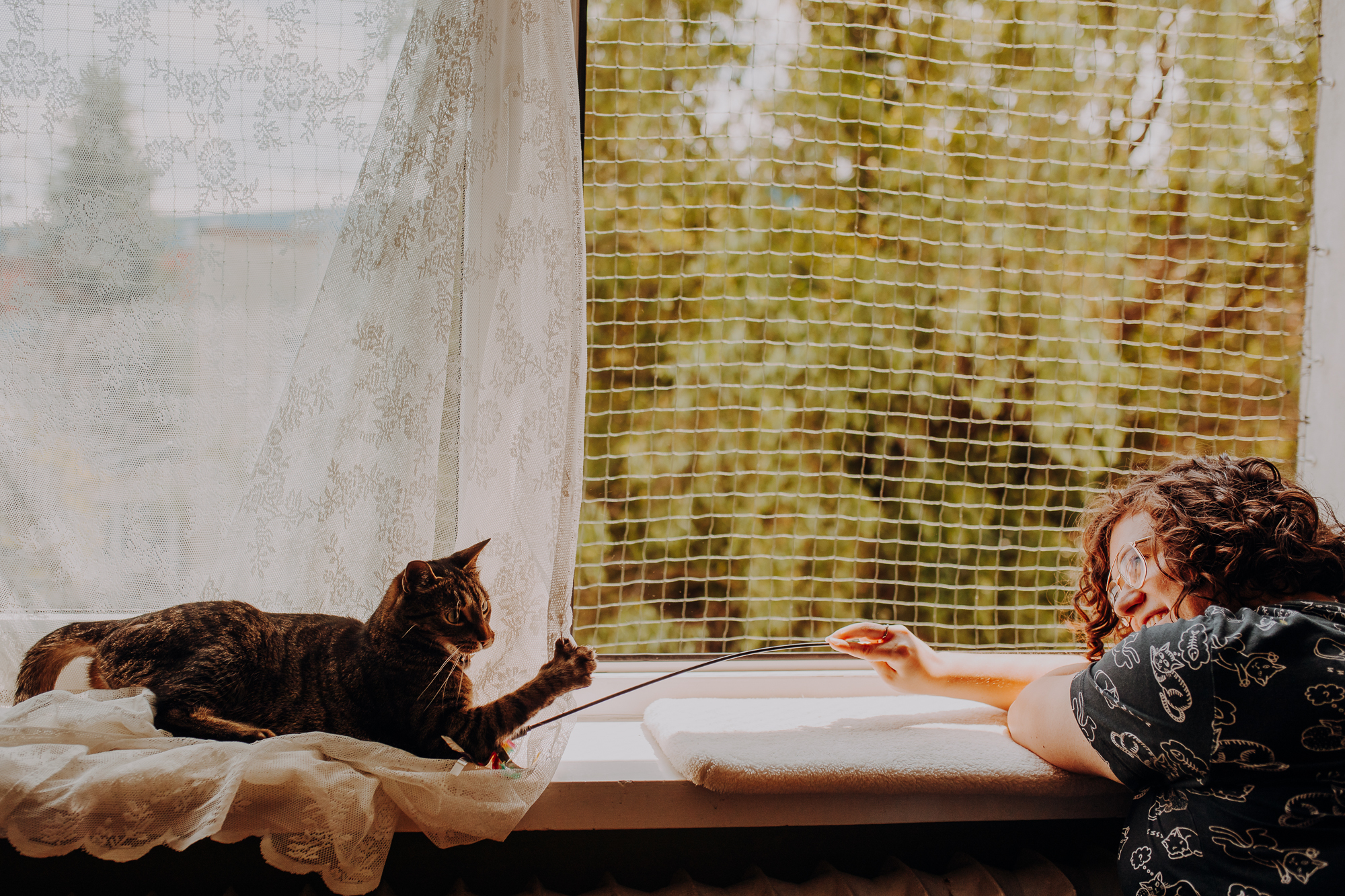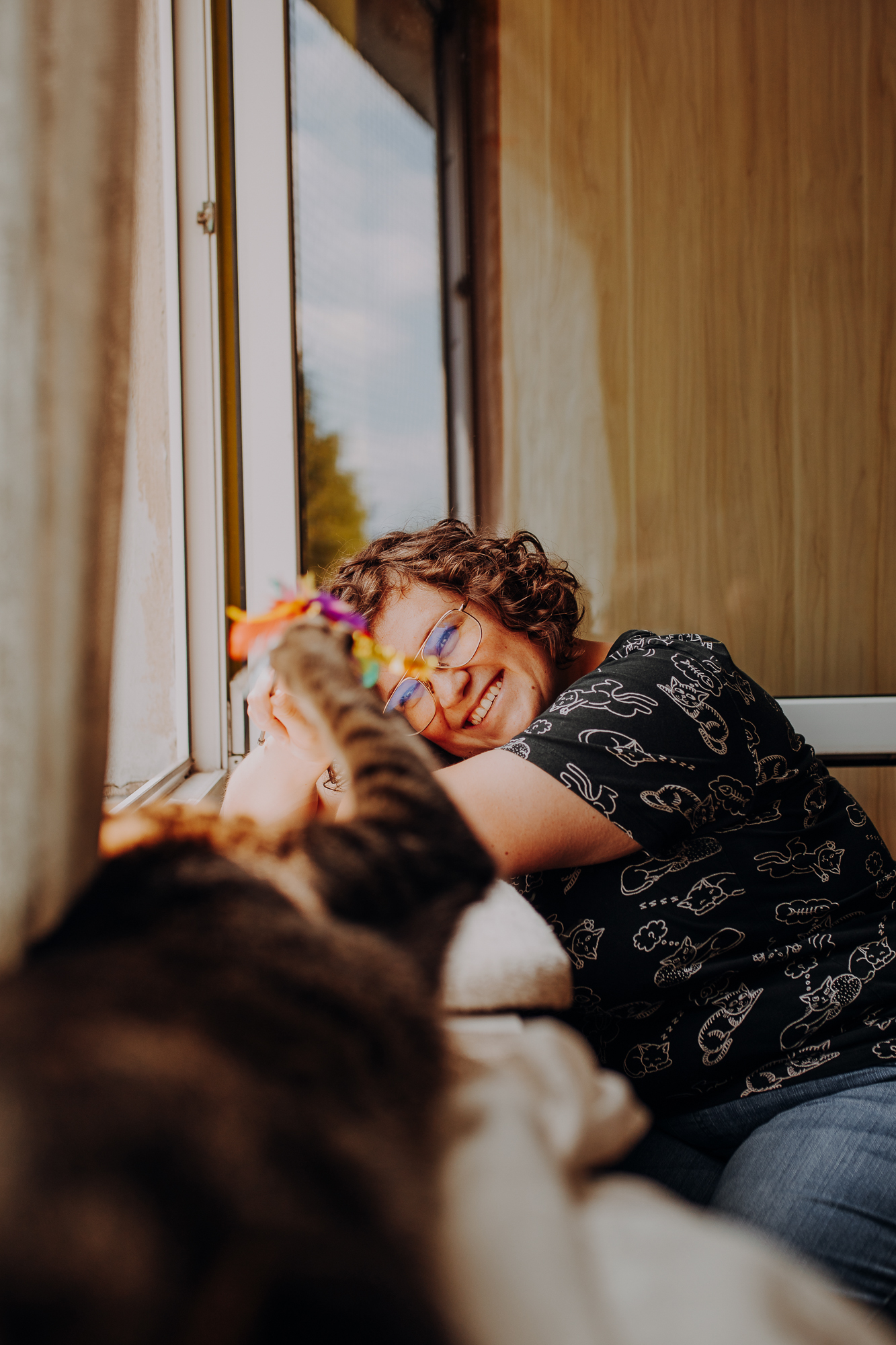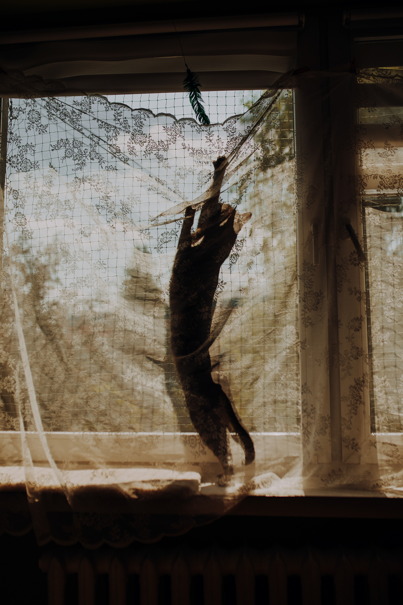 Magda mnie uprzedziła, że Leoś początkowo może mną wzgardzić, a Bonaparte przyglądać mi się jedynie z boku i obserwować, czy w ogóle opłaca mu się do mnie podejść. Na szczęście miałam ze sobą MAGICZNE PIÓRKA które bardzo szybko przekonały wszystkie koty do współpracy. Magisterka, która wyszła już do mnie na samym początku - żeby obwąchać moją torbę też była zainteresowana nową zabawką. Zdjęcia z wędką robiłyśmy głównie na hamaku, więc kotki mogły poczuć się jak prawdziwe tarzany, gdy wspinały się po jego niestabilnej konstrukcji.