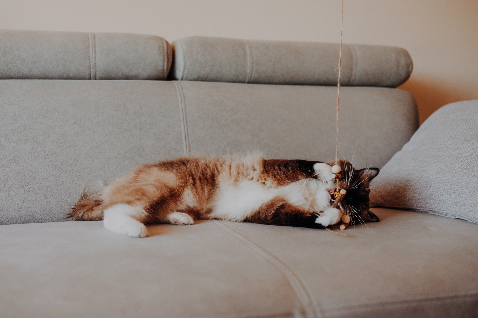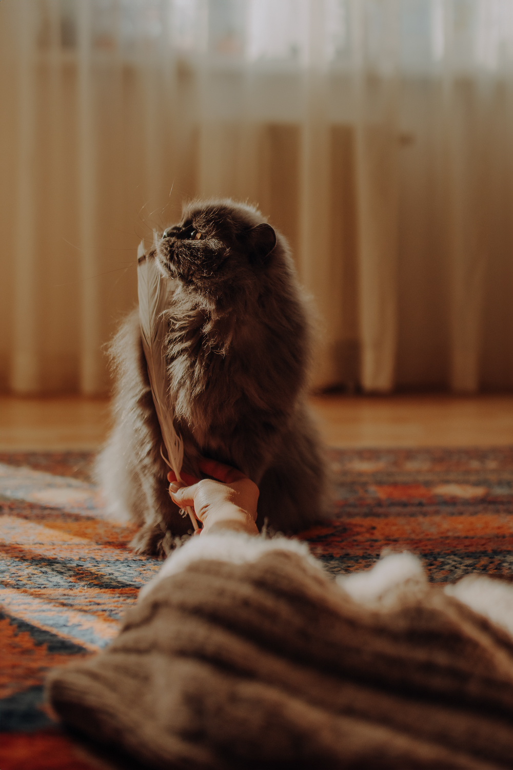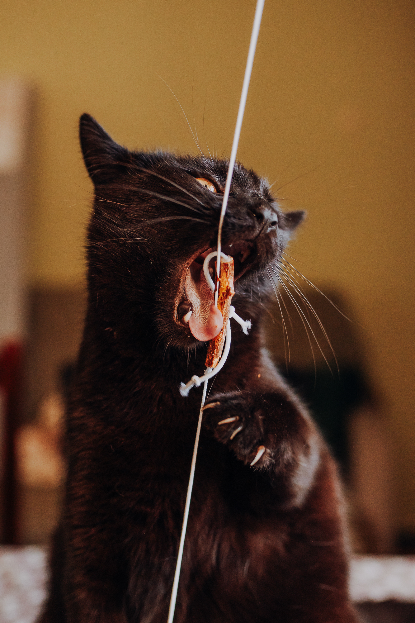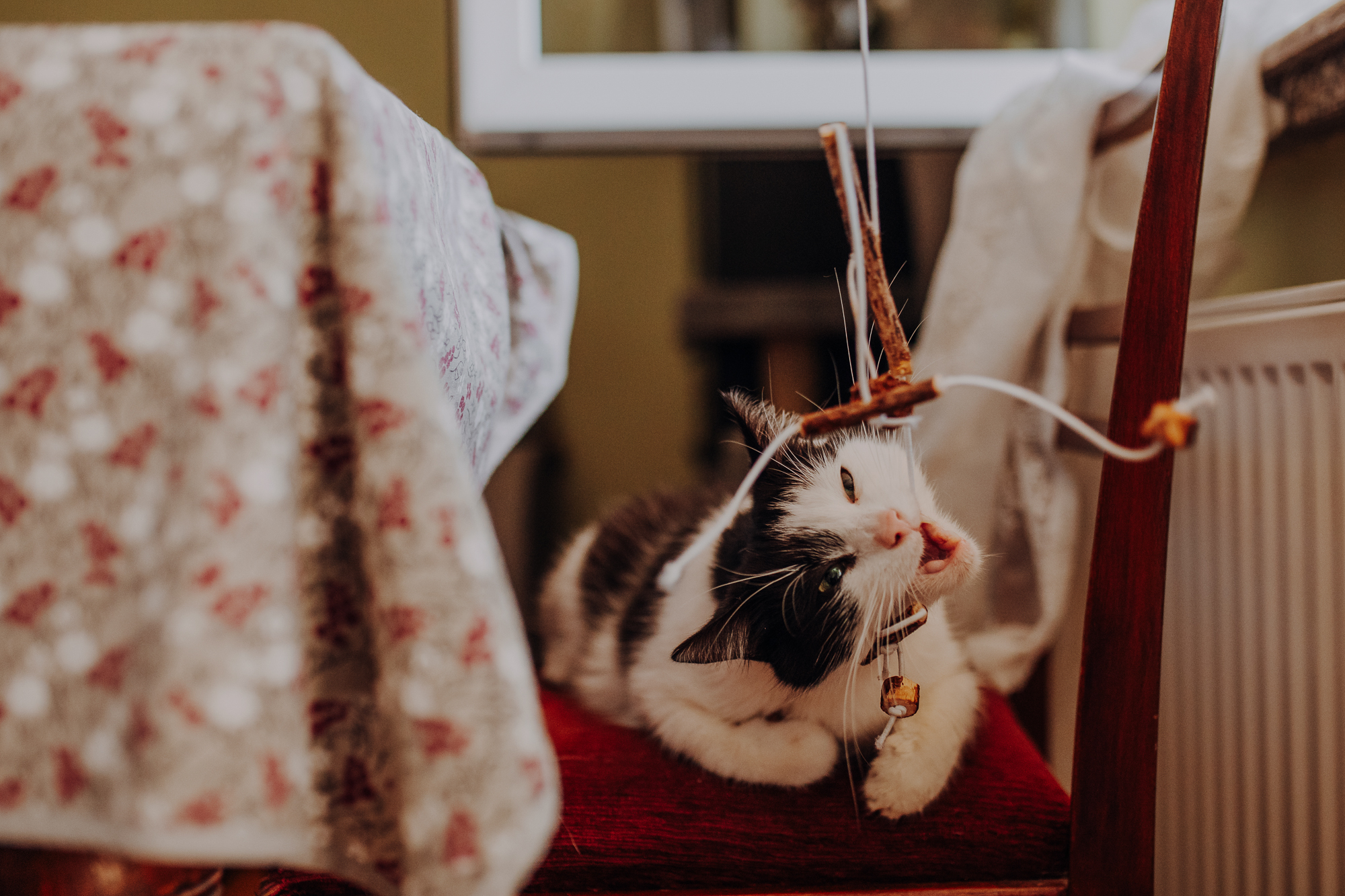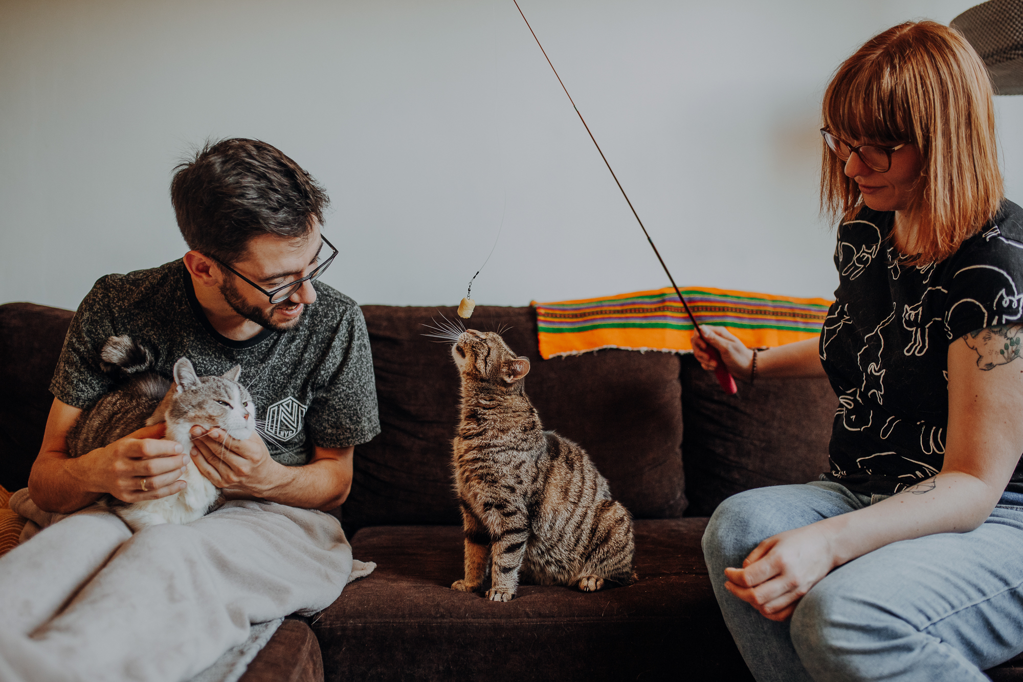 Magda mnie uprzedziła, że Leoś początkowo może mną wzgardzić, a Bonaparte przyglądać mi się jedynie z boku i obserwować, czy w ogóle opłaca mu się do mnie podejść. Na szczęście miałam ze sobą MAGICZNE PIÓRKA które bardzo szybko przekonały wszystkie koty do współpracy. Magisterka, która wyszła już do mnie na samym początku - żeby obwąchać moją torbę też była zainteresowana nową zabawką. Zdjęcia z wędką robiłyśmy głównie na hamaku, więc kotki mogły poczuć się jak prawdziwe tarzany, gdy wspinały się po jego niestabilnej konstrukcji.