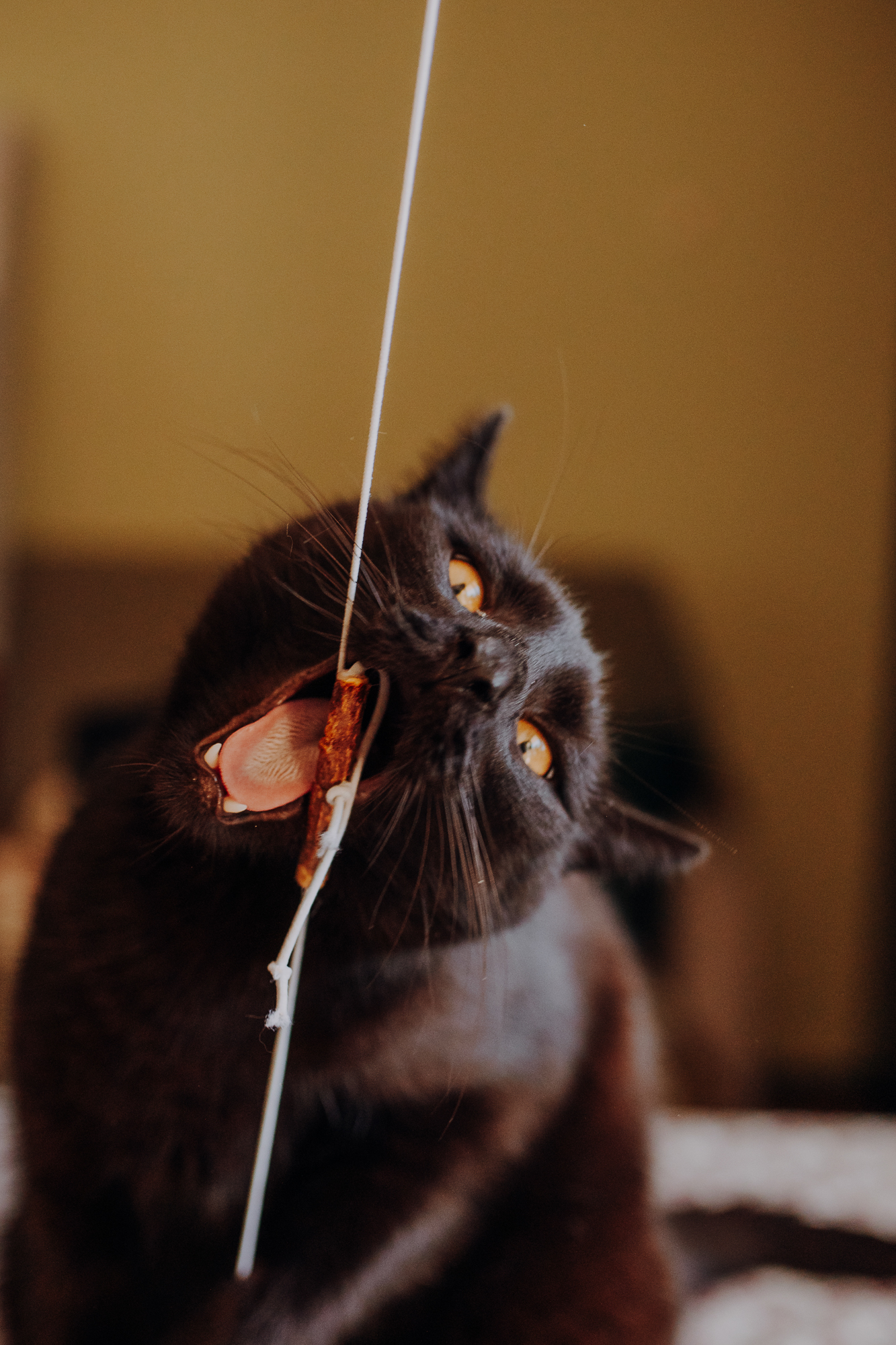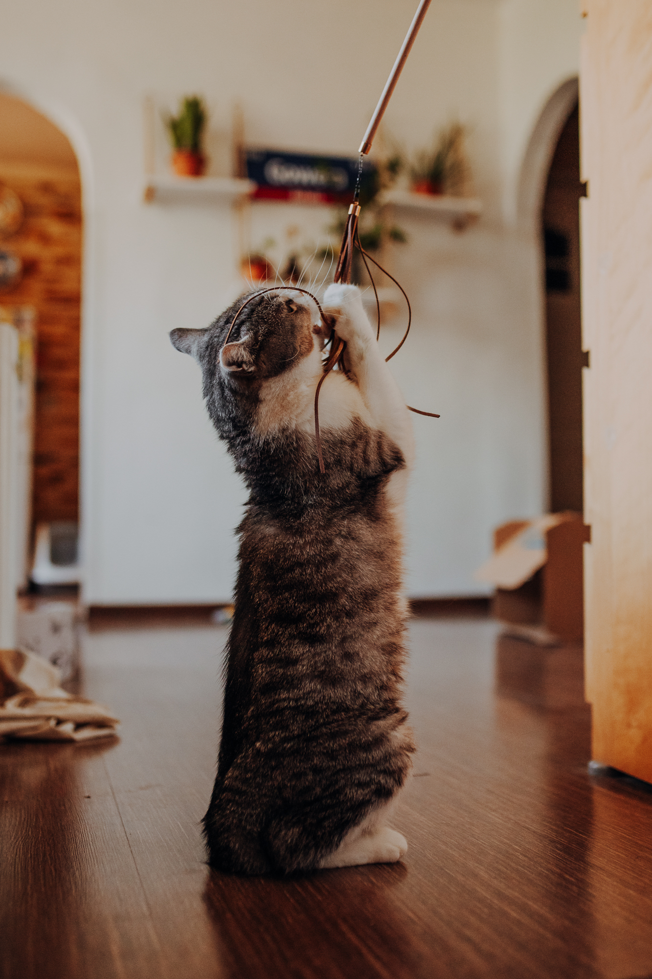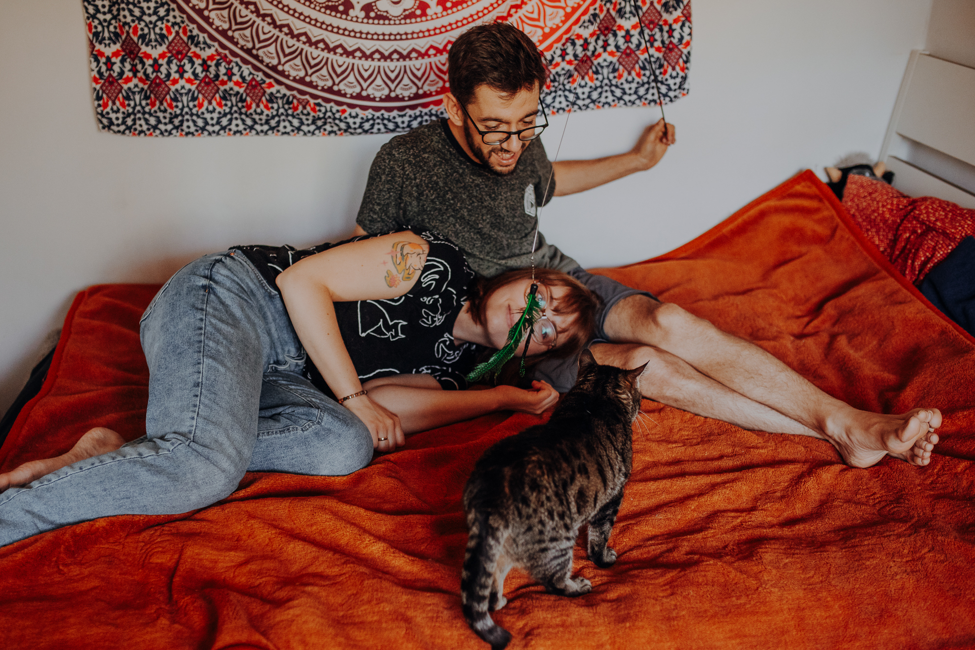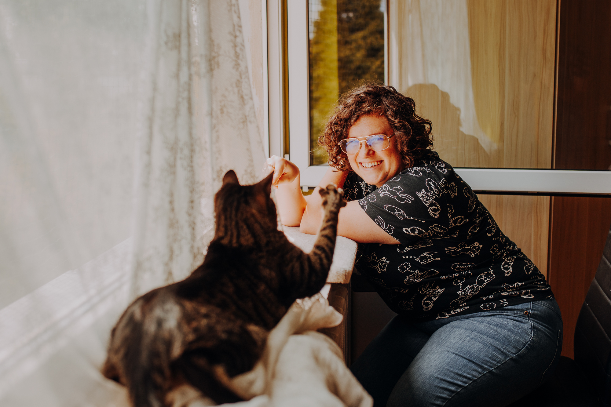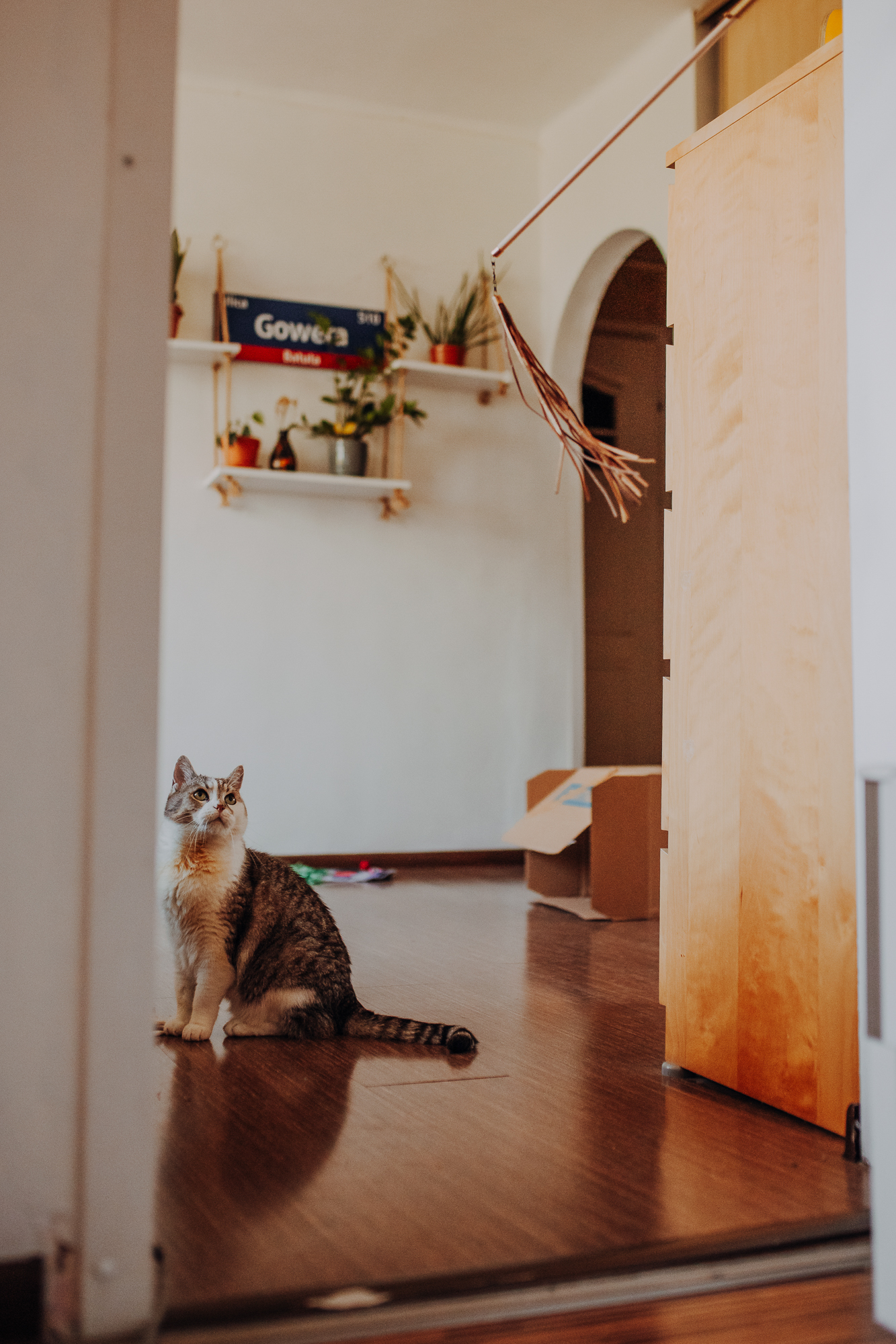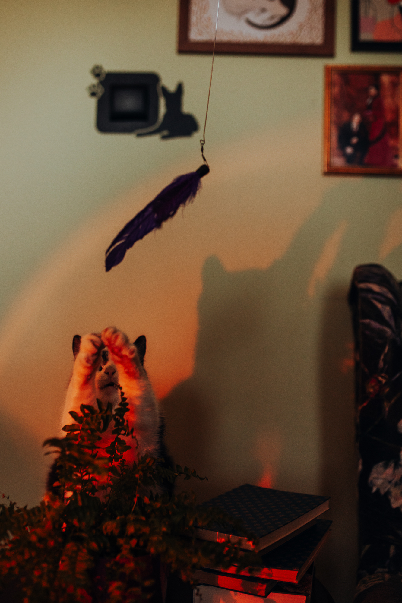 Magda mnie uprzedziła, że Leoś początkowo może mną wzgardzić, a Bonaparte przyglądać mi się jedynie z boku i obserwować, czy w ogóle opłaca mu się do mnie podejść. Na szczęście miałam ze sobą MAGICZNE PIÓRKA które bardzo szybko przekonały wszystkie koty do współpracy. Magisterka, która wyszła już do mnie na samym początku - żeby obwąchać moją torbę też była zainteresowana nową zabawką. Zdjęcia z wędką robiłyśmy głównie na hamaku, więc kotki mogły poczuć się jak prawdziwe tarzany, gdy wspinały się po jego niestabilnej konstrukcji.