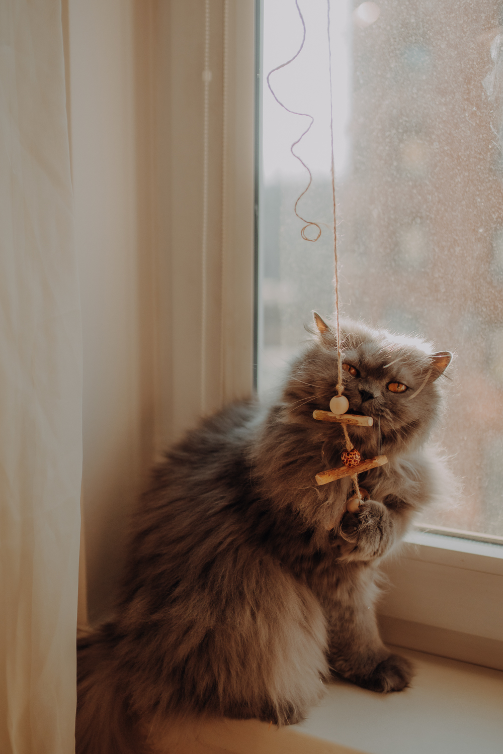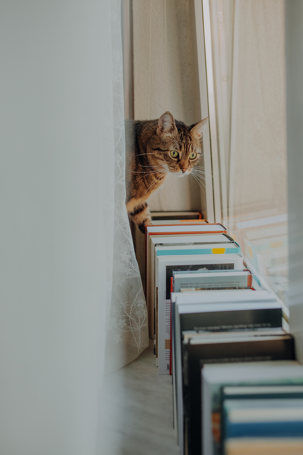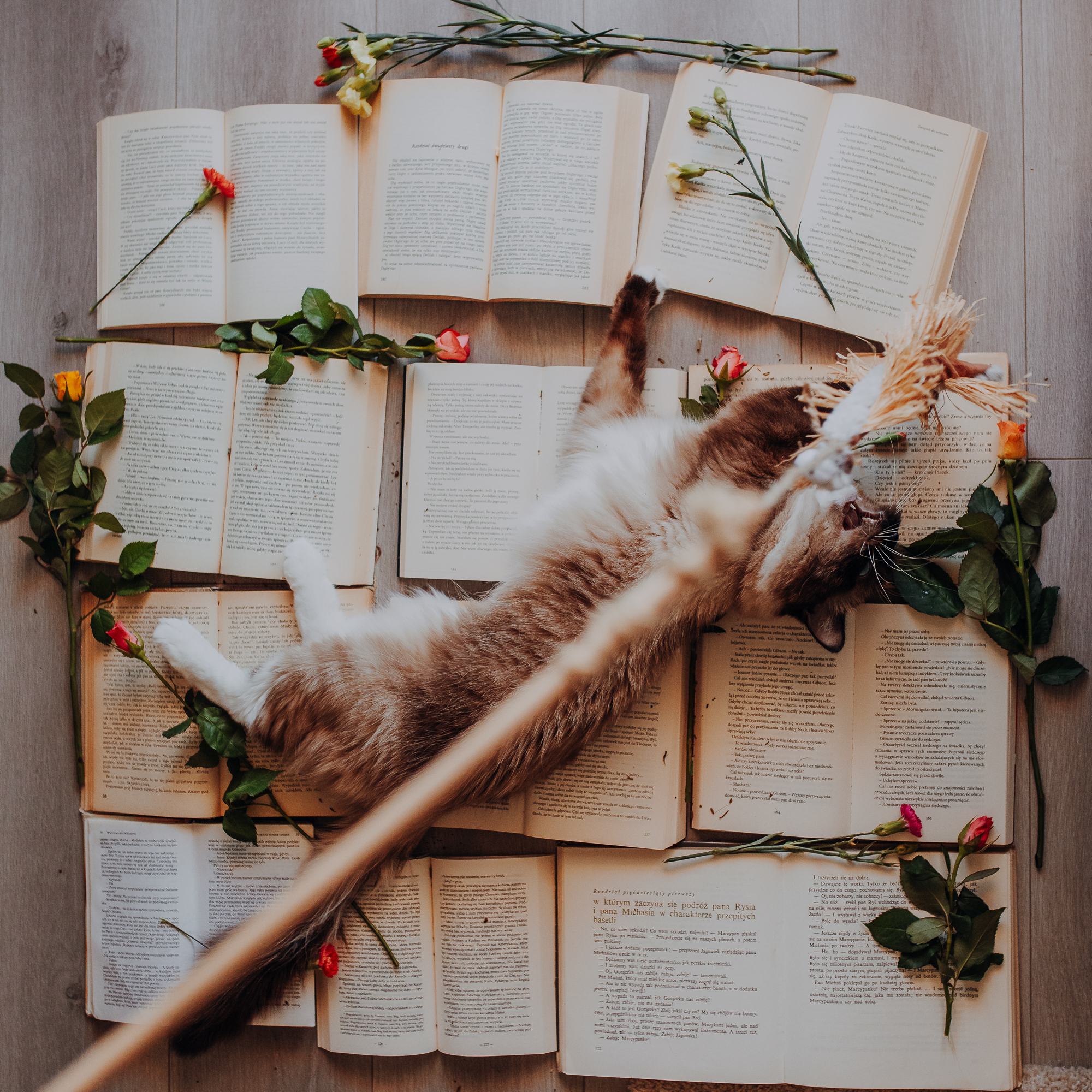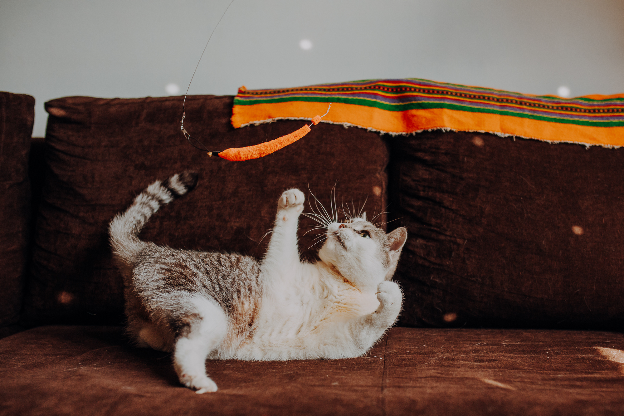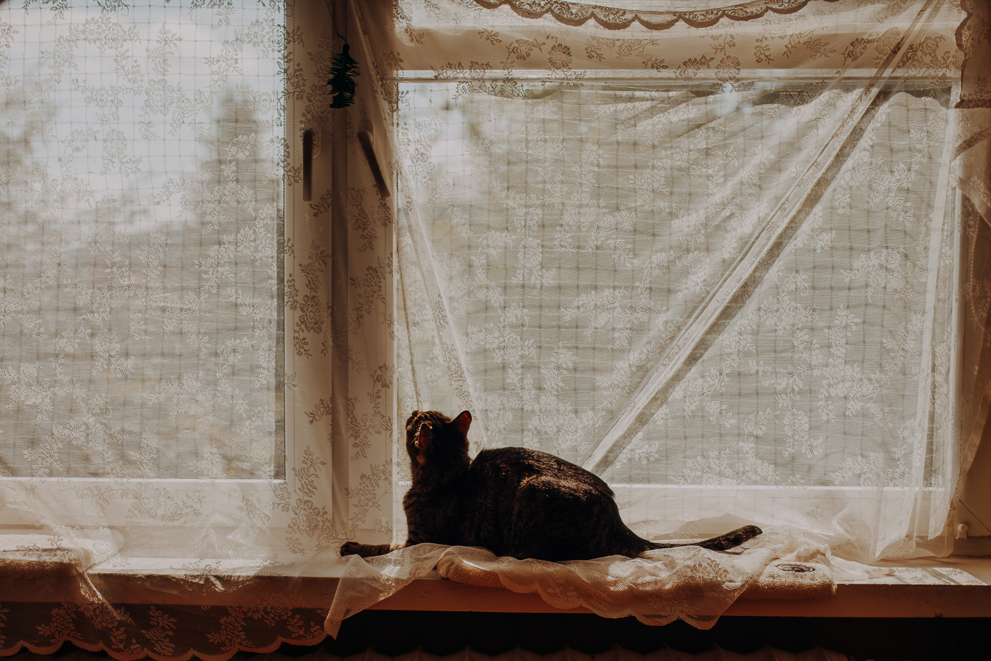 Magda mnie uprzedziła, że Leoś początkowo może mną wzgardzić, a Bonaparte przyglądać mi się jedynie z boku i obserwować, czy w ogóle opłaca mu się do mnie podejść. Na szczęście miałam ze sobą MAGICZNE PIÓRKA które bardzo szybko przekonały wszystkie koty do współpracy. Magisterka, która wyszła już do mnie na samym początku - żeby obwąchać moją torbę też była zainteresowana nową zabawką. Zdjęcia z wędką robiłyśmy głównie na hamaku, więc kotki mogły poczuć się jak prawdziwe tarzany, gdy wspinały się po jego niestabilnej konstrukcji.