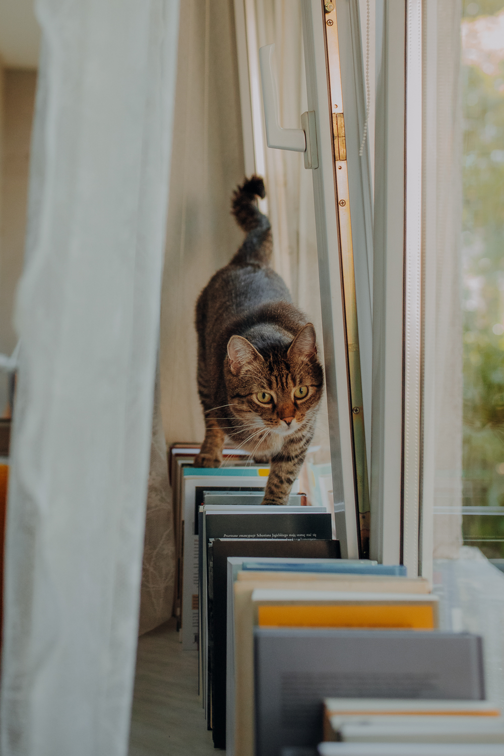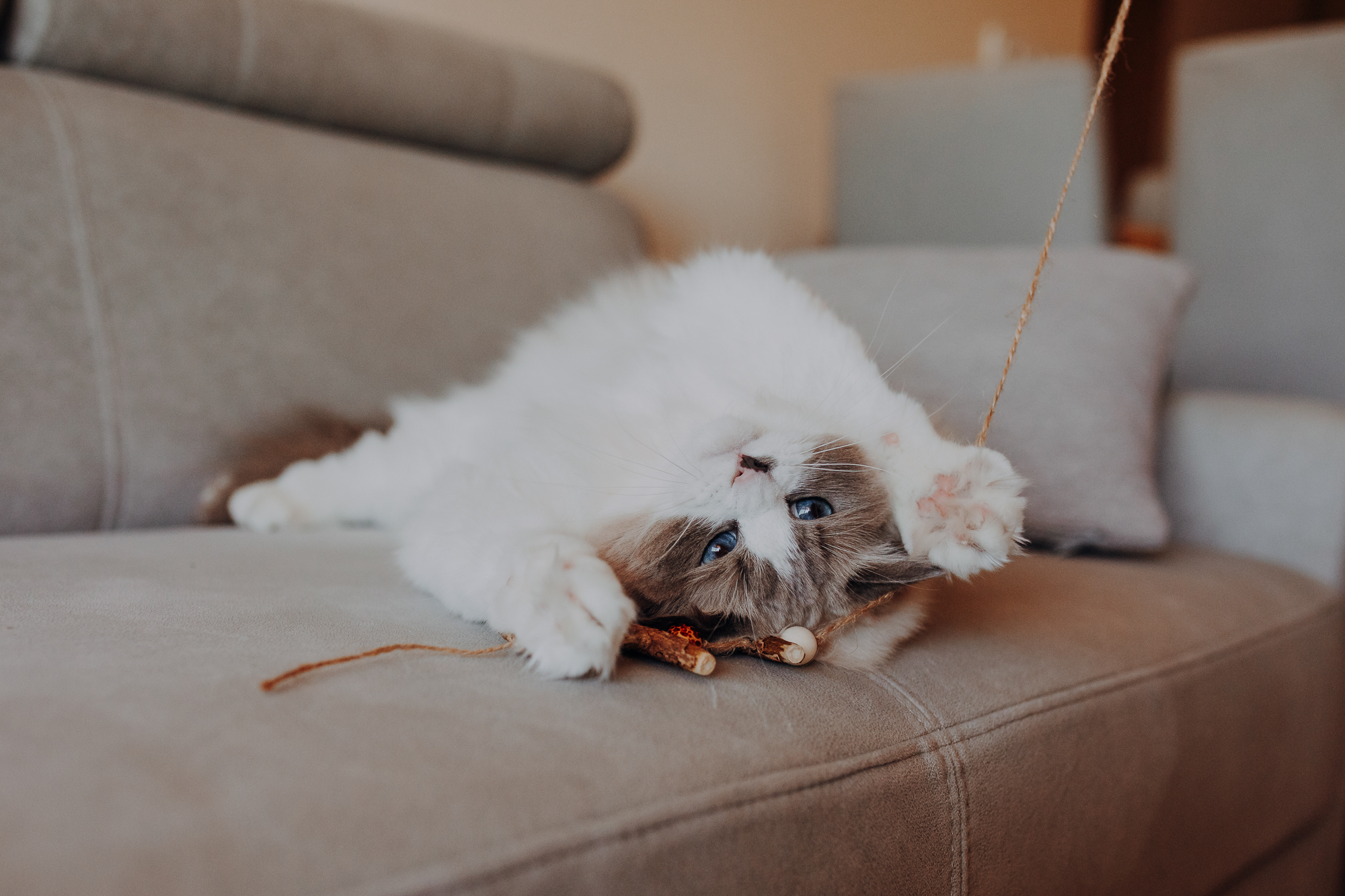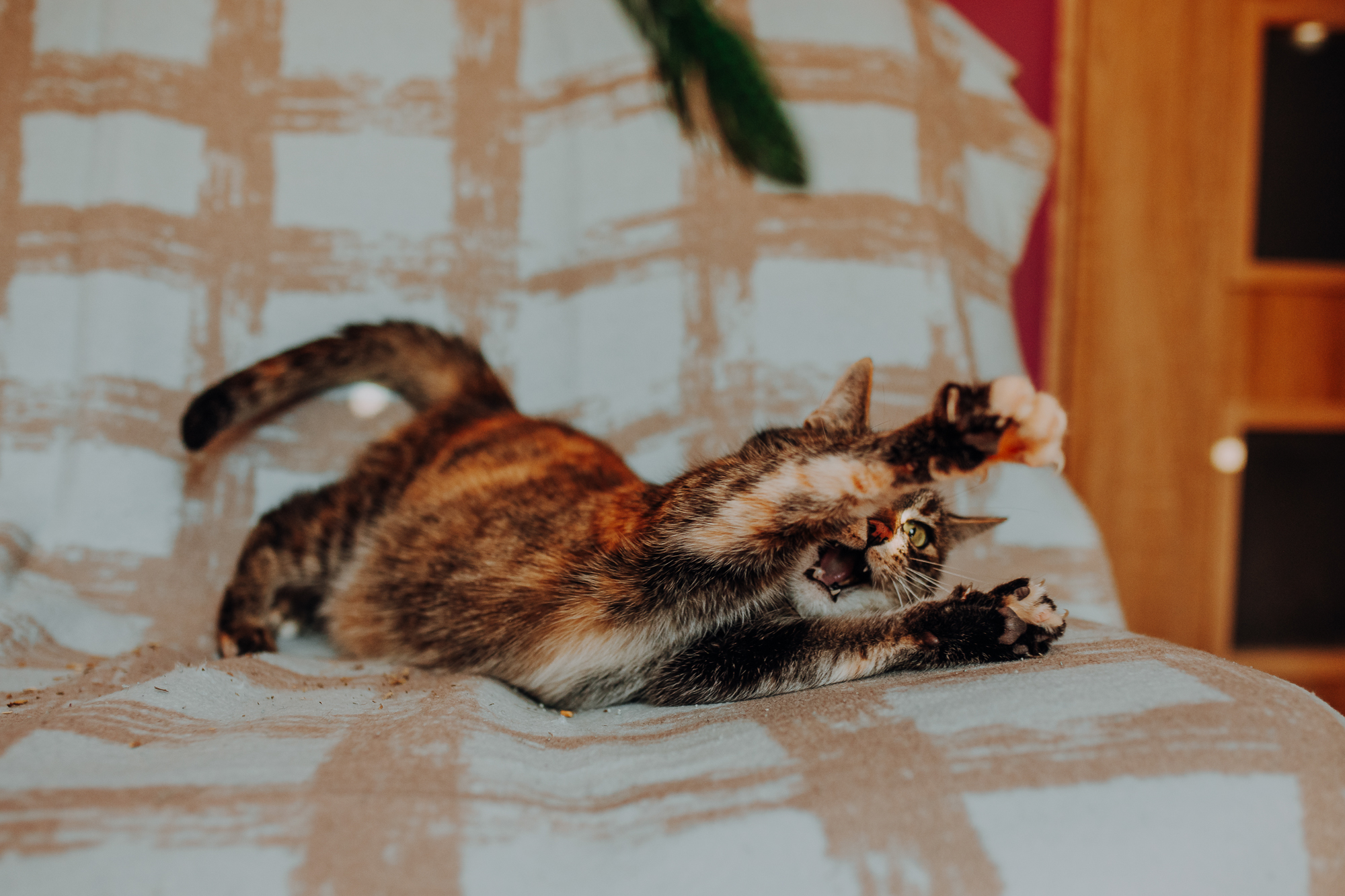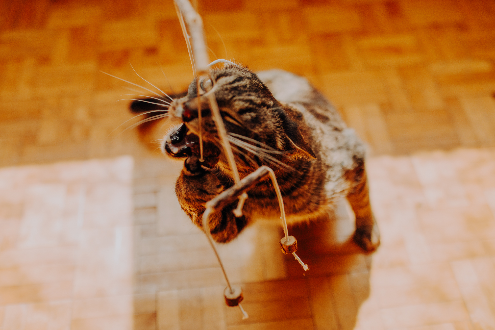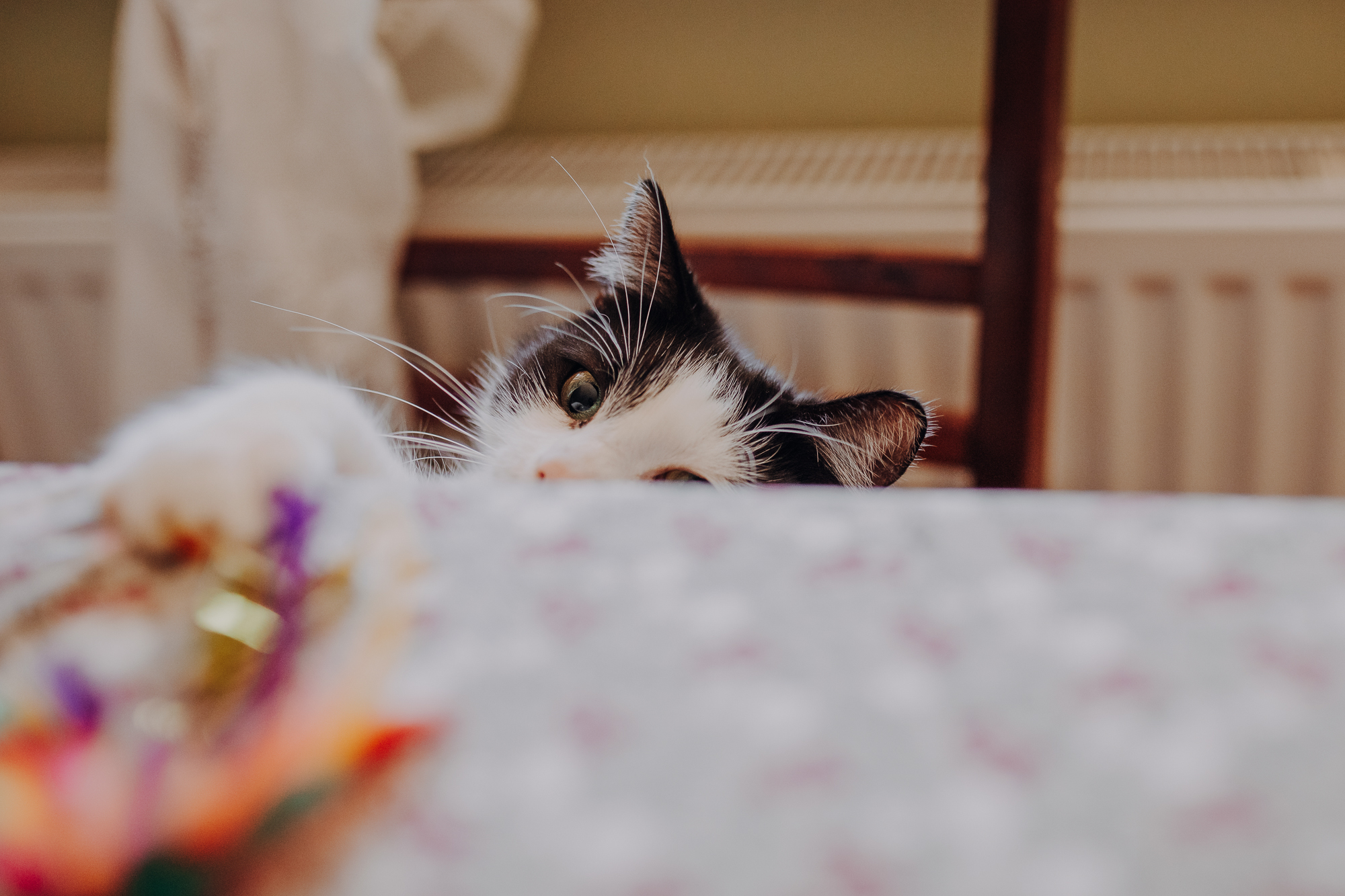 Magda mnie uprzedziła, że Leoś początkowo może mną wzgardzić, a Bonaparte przyglądać mi się jedynie z boku i obserwować, czy w ogóle opłaca mu się do mnie podejść. Na szczęście miałam ze sobą MAGICZNE PIÓRKA które bardzo szybko przekonały wszystkie koty do współpracy. Magisterka, która wyszła już do mnie na samym początku - żeby obwąchać moją torbę też była zainteresowana nową zabawką. Zdjęcia z wędką robiłyśmy głównie na hamaku, więc kotki mogły poczuć się jak prawdziwe tarzany, gdy wspinały się po jego niestabilnej konstrukcji.