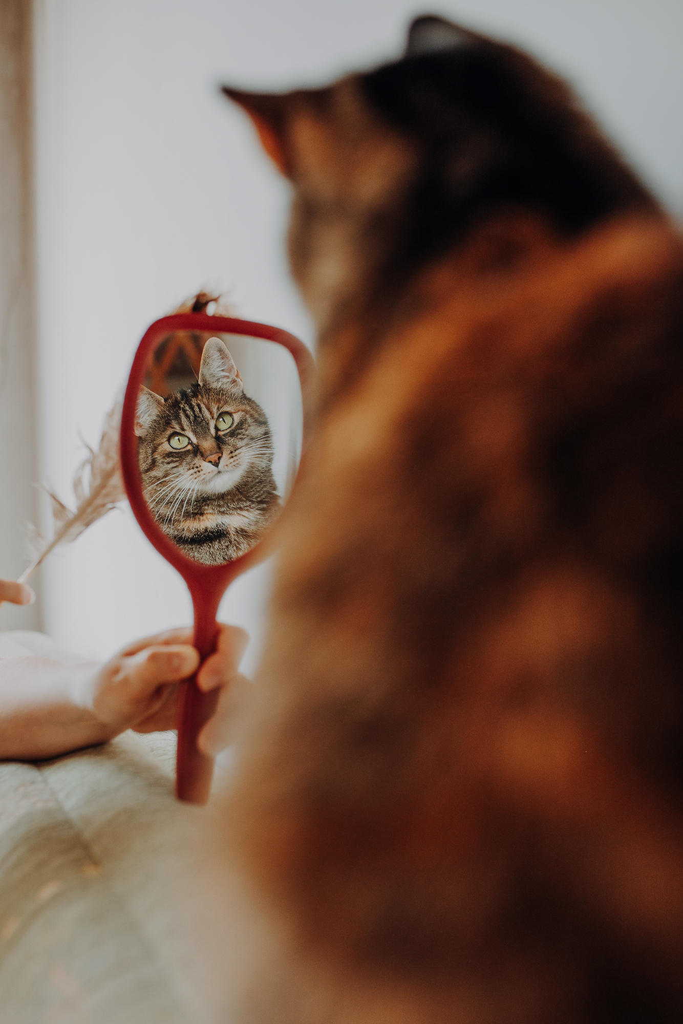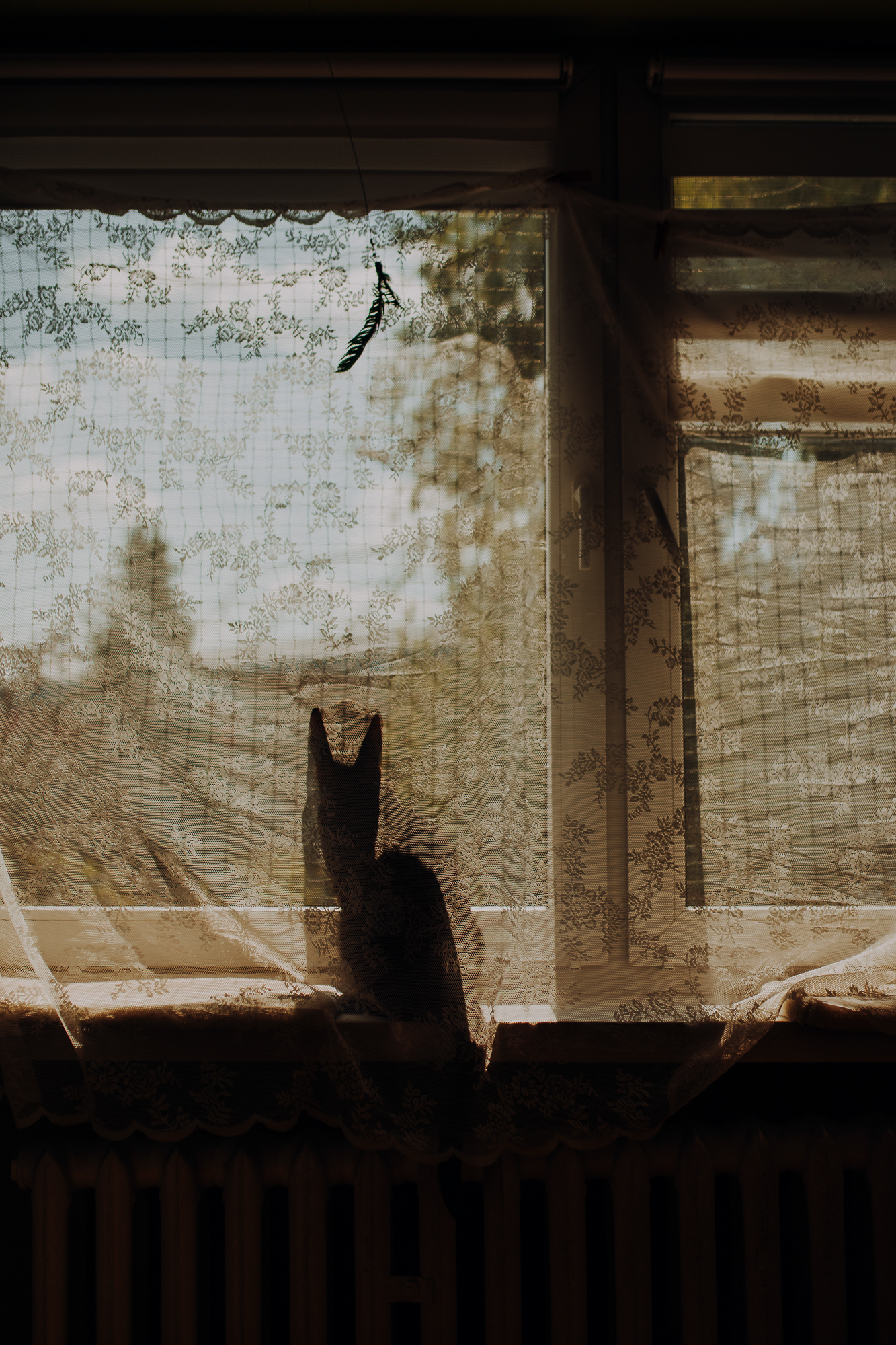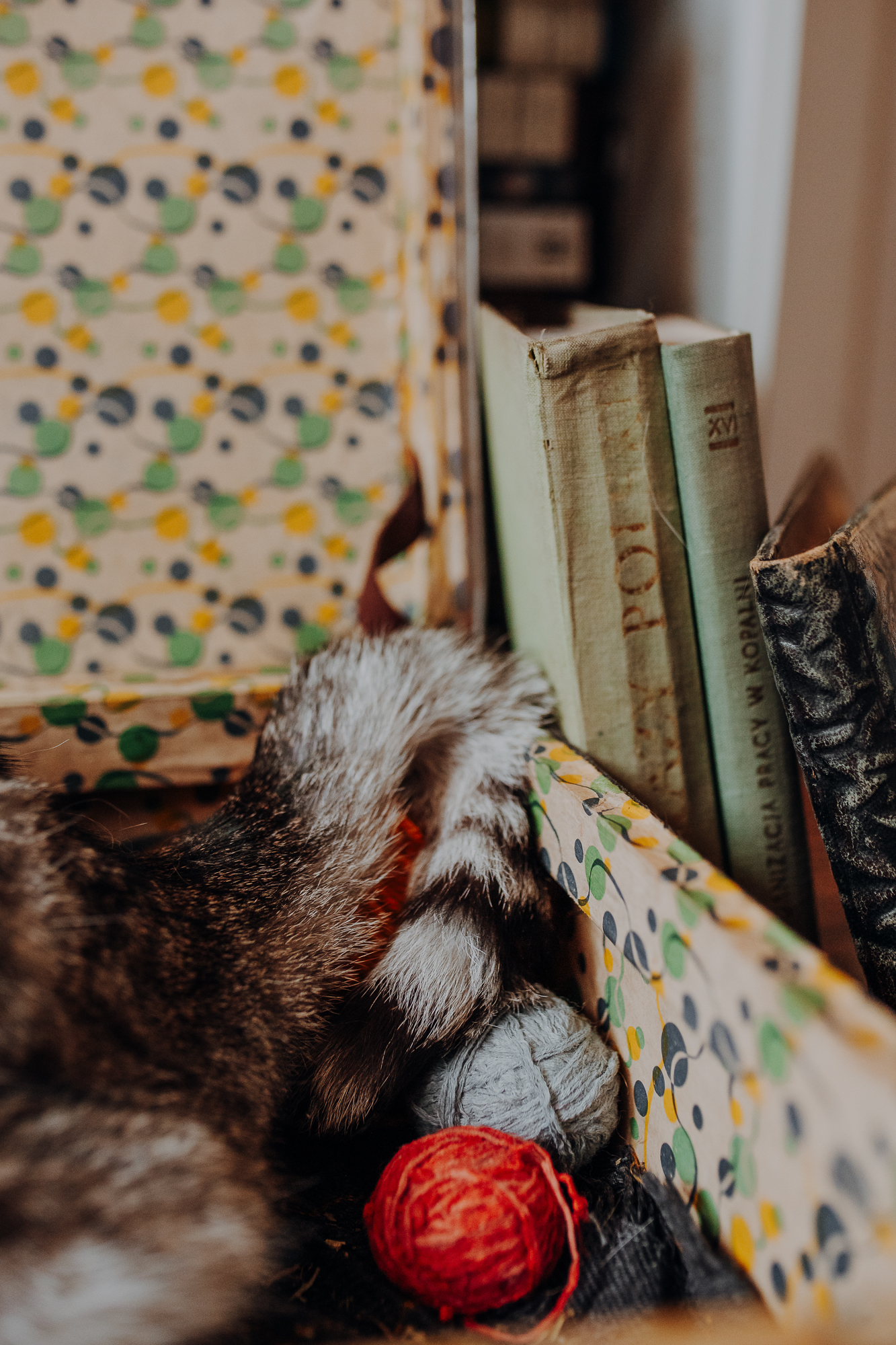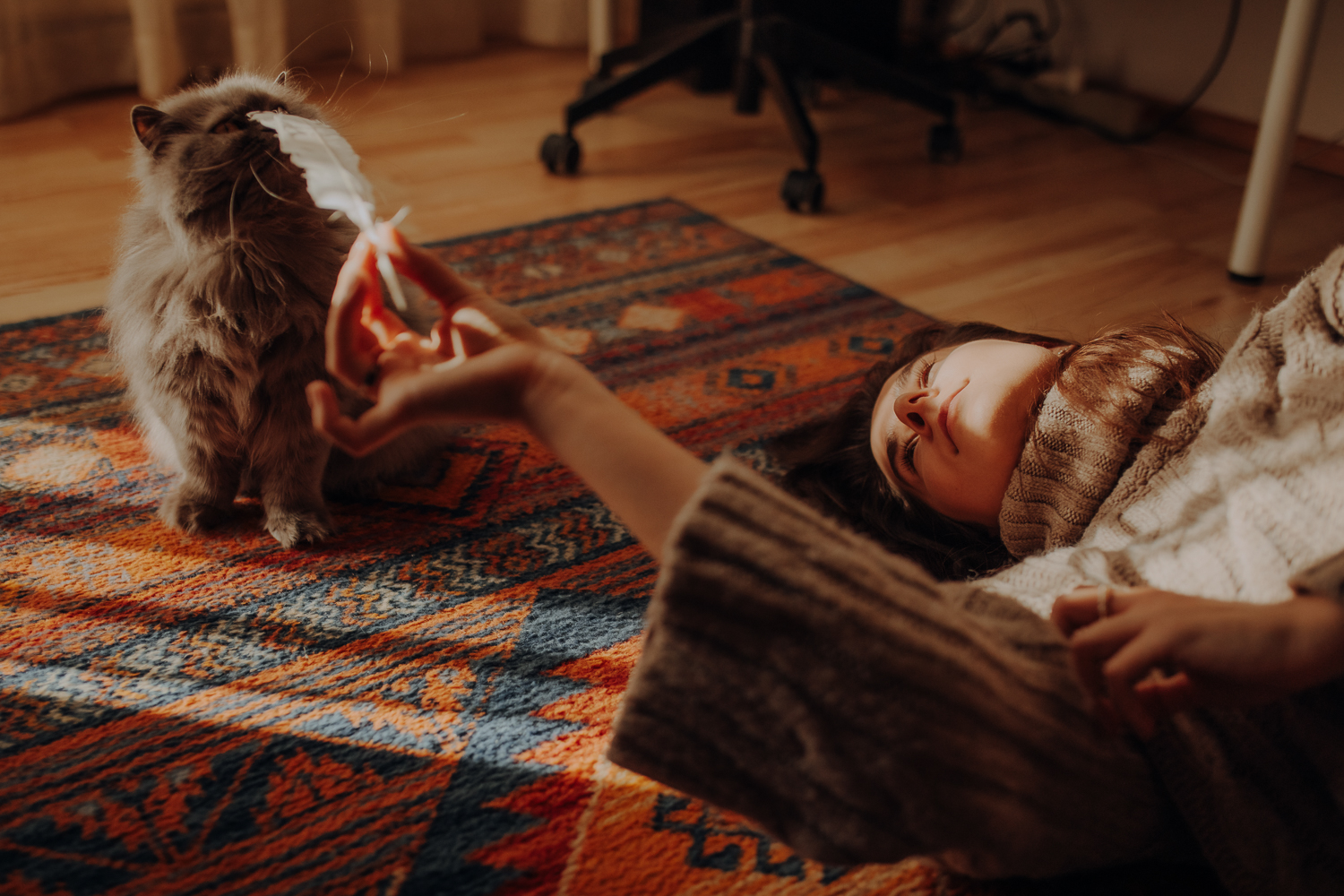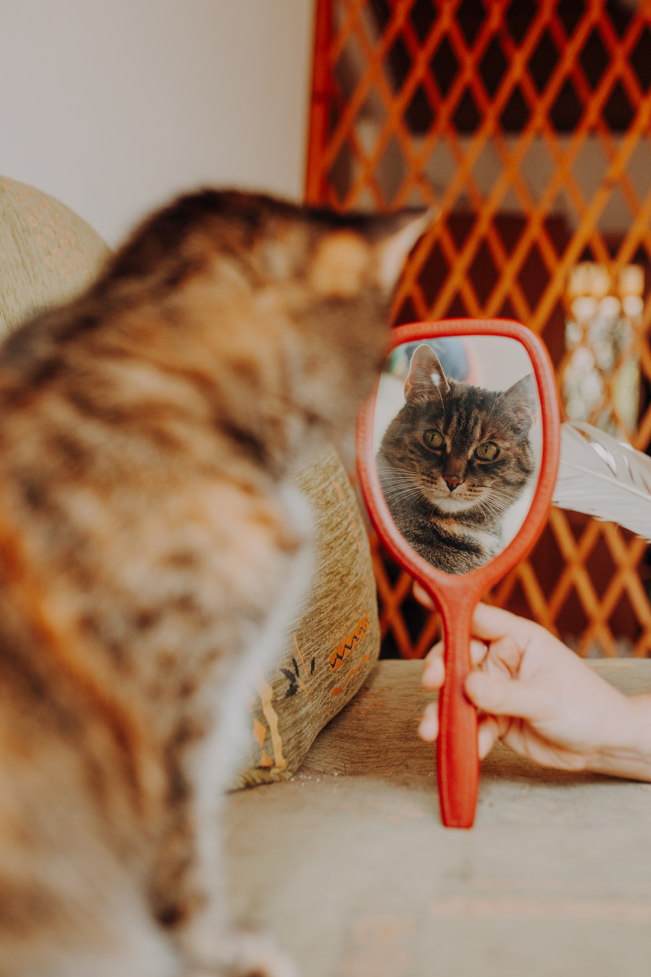 Magda mnie uprzedziła, że Leoś początkowo może mną wzgardzić, a Bonaparte przyglądać mi się jedynie z boku i obserwować, czy w ogóle opłaca mu się do mnie podejść. Na szczęście miałam ze sobą MAGICZNE PIÓRKA które bardzo szybko przekonały wszystkie koty do współpracy. Magisterka, która wyszła już do mnie na samym początku - żeby obwąchać moją torbę też była zainteresowana nową zabawką. Zdjęcia z wędką robiłyśmy głównie na hamaku, więc kotki mogły poczuć się jak prawdziwe tarzany, gdy wspinały się po jego niestabilnej konstrukcji.