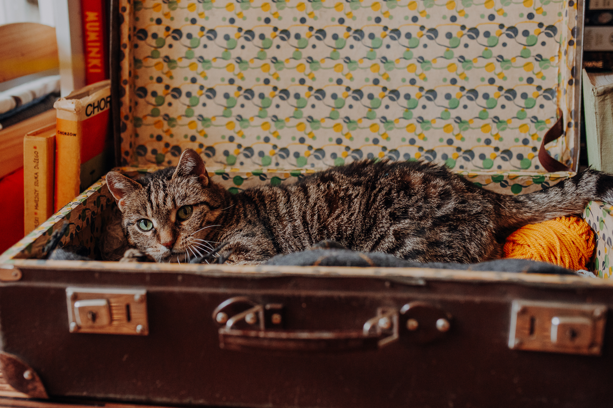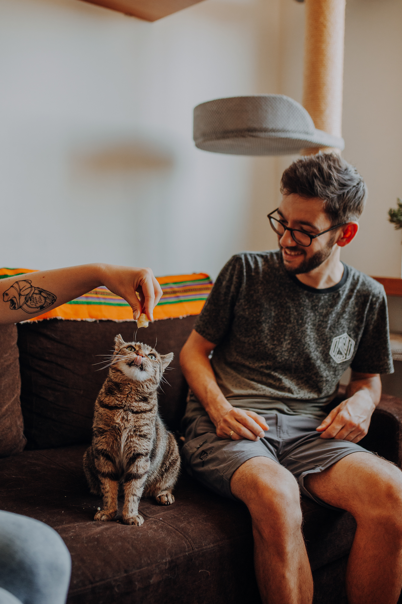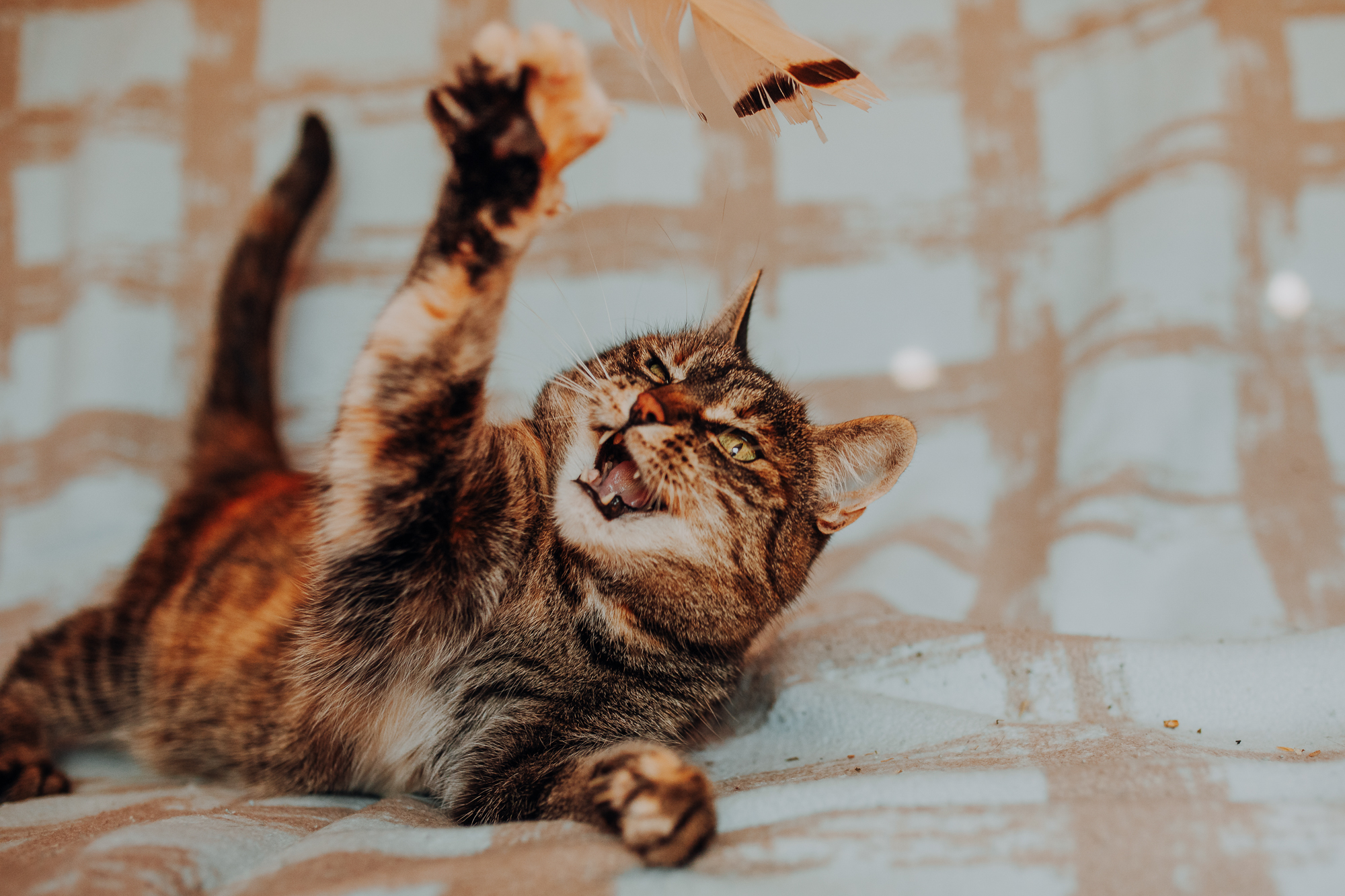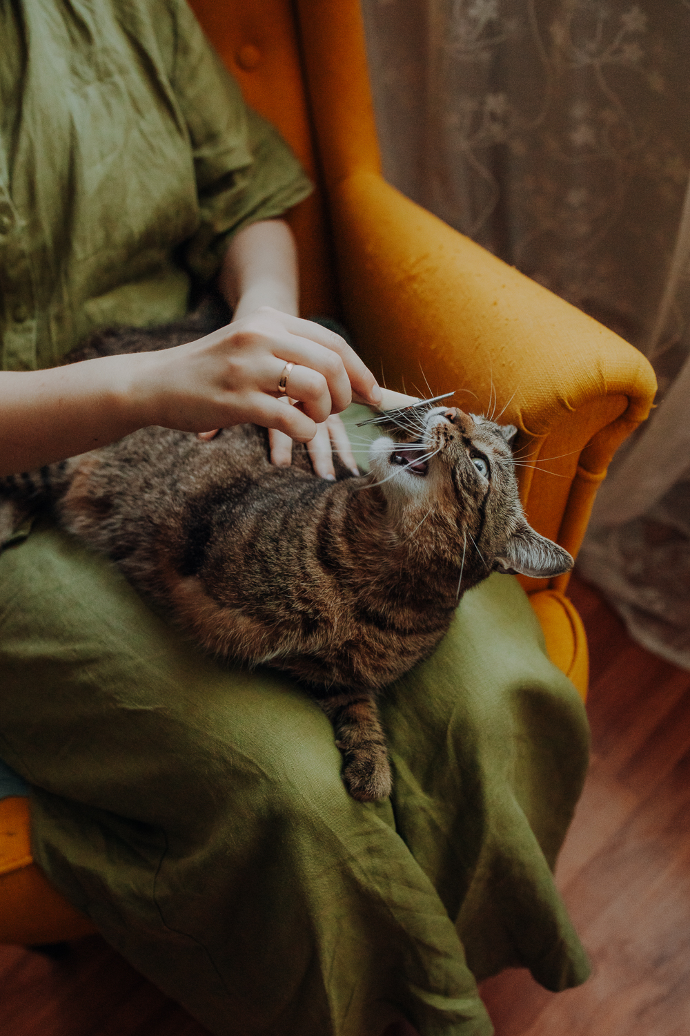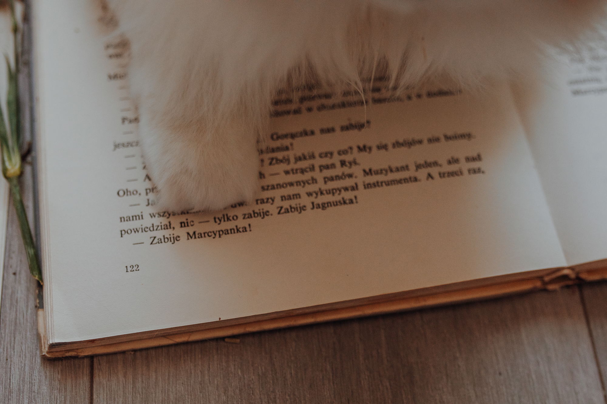 Magda mnie uprzedziła, że Leoś początkowo może mną wzgardzić, a Bonaparte przyglądać mi się jedynie z boku i obserwować, czy w ogóle opłaca mu się do mnie podejść. Na szczęście miałam ze sobą MAGICZNE PIÓRKA które bardzo szybko przekonały wszystkie koty do współpracy. Magisterka, która wyszła już do mnie na samym początku - żeby obwąchać moją torbę też była zainteresowana nową zabawką. Zdjęcia z wędką robiłyśmy głównie na hamaku, więc kotki mogły poczuć się jak prawdziwe tarzany, gdy wspinały się po jego niestabilnej konstrukcji.