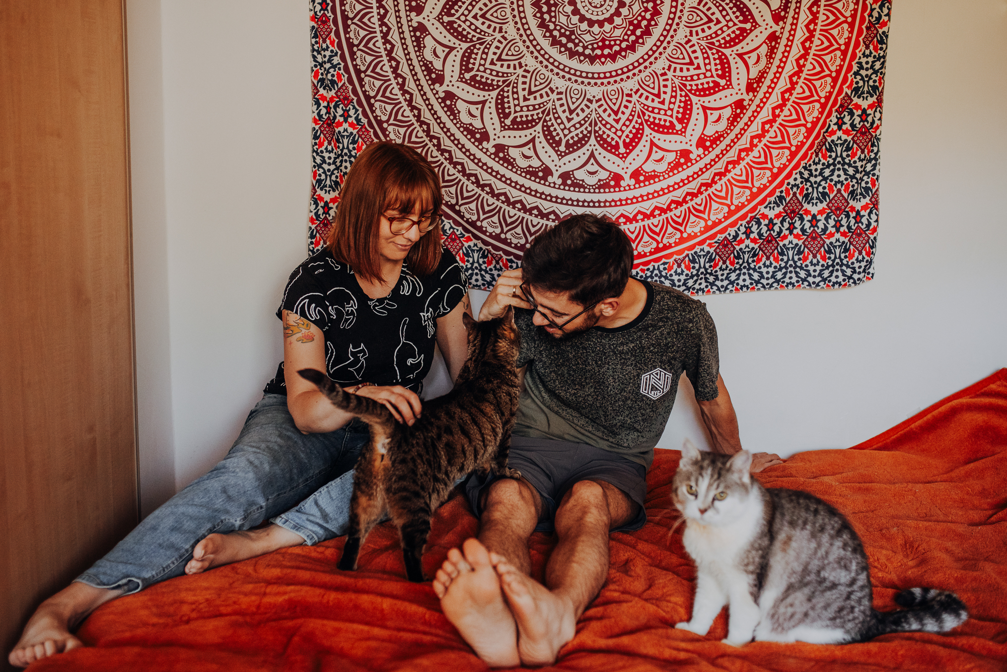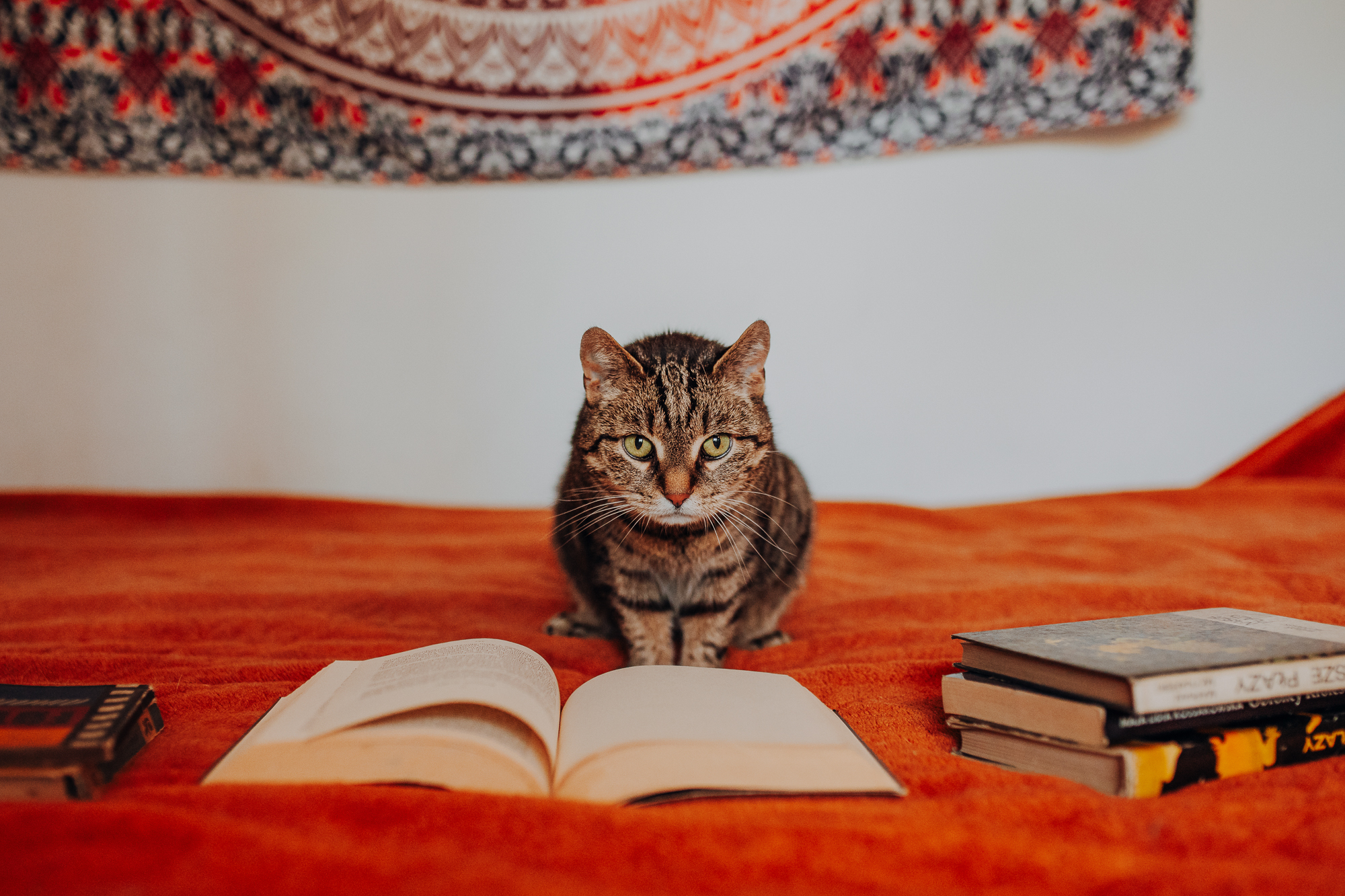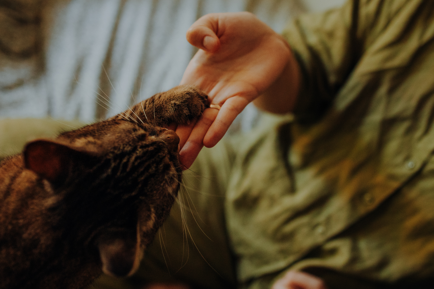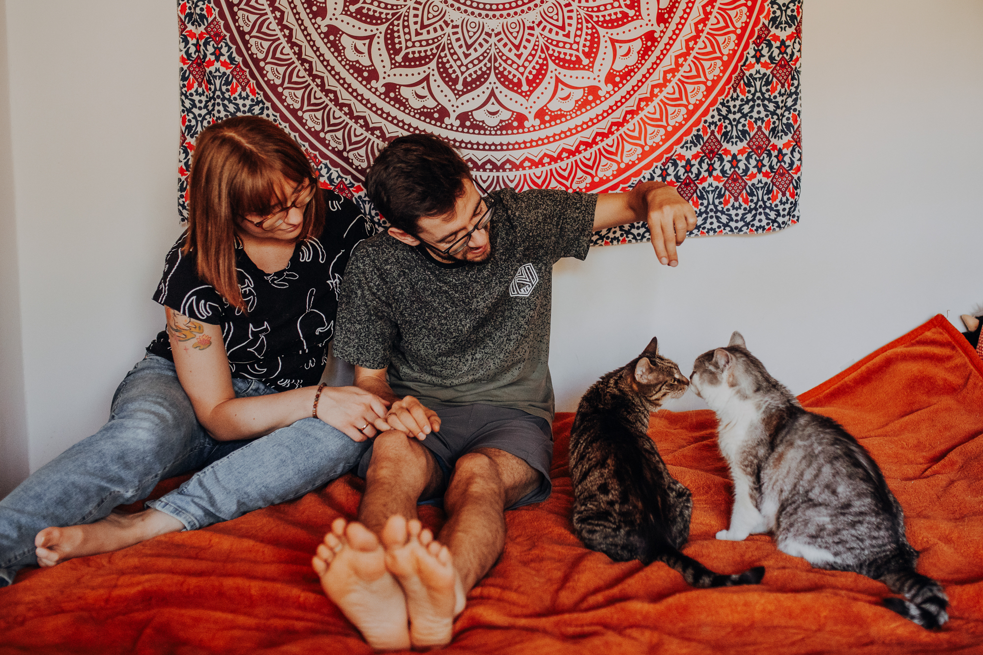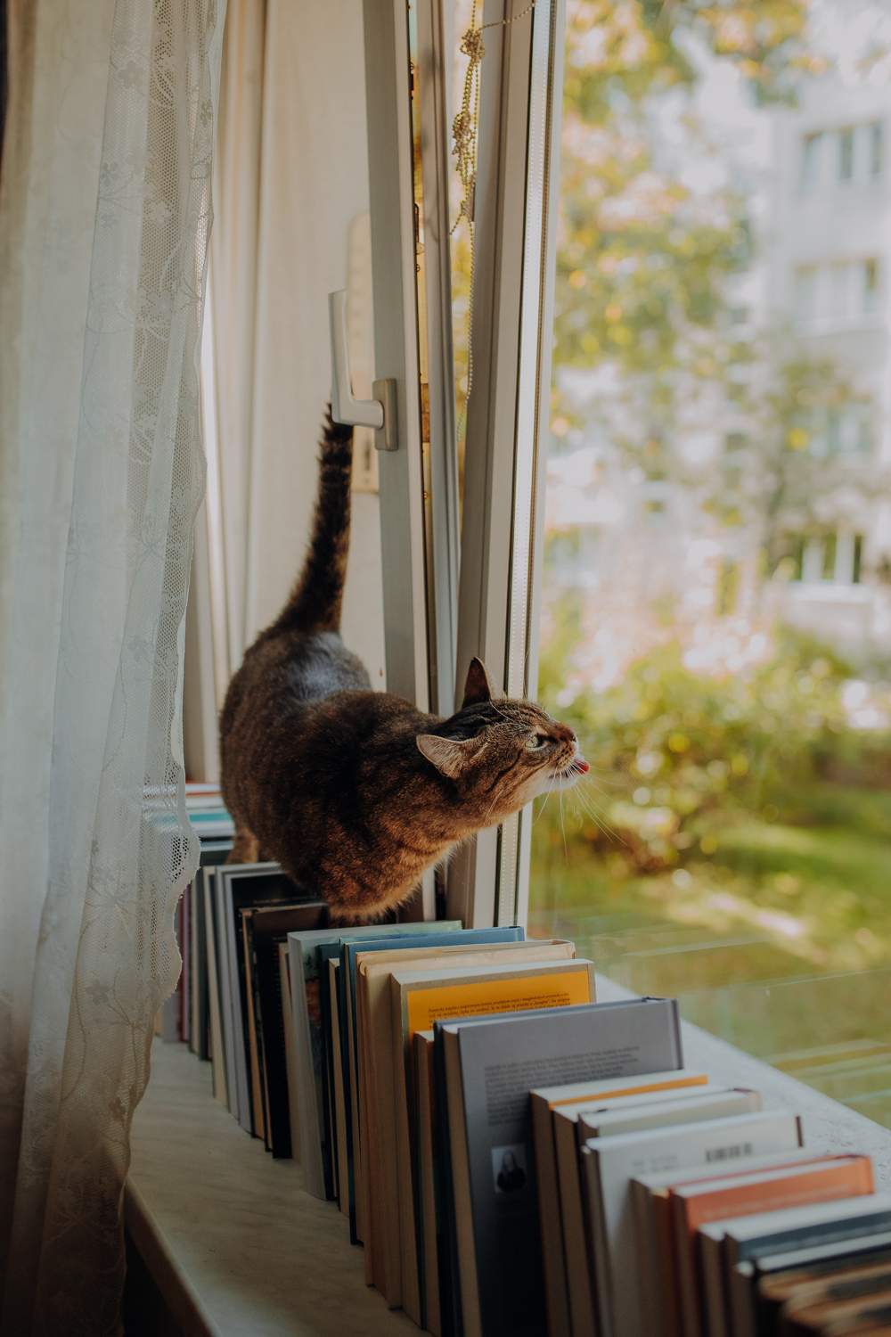 Magda mnie uprzedziła, że Leoś początkowo może mną wzgardzić, a Bonaparte przyglądać mi się jedynie z boku i obserwować, czy w ogóle opłaca mu się do mnie podejść. Na szczęście miałam ze sobą MAGICZNE PIÓRKA które bardzo szybko przekonały wszystkie koty do współpracy. Magisterka, która wyszła już do mnie na samym początku - żeby obwąchać moją torbę też była zainteresowana nową zabawką. Zdjęcia z wędką robiłyśmy głównie na hamaku, więc kotki mogły poczuć się jak prawdziwe tarzany, gdy wspinały się po jego niestabilnej konstrukcji.