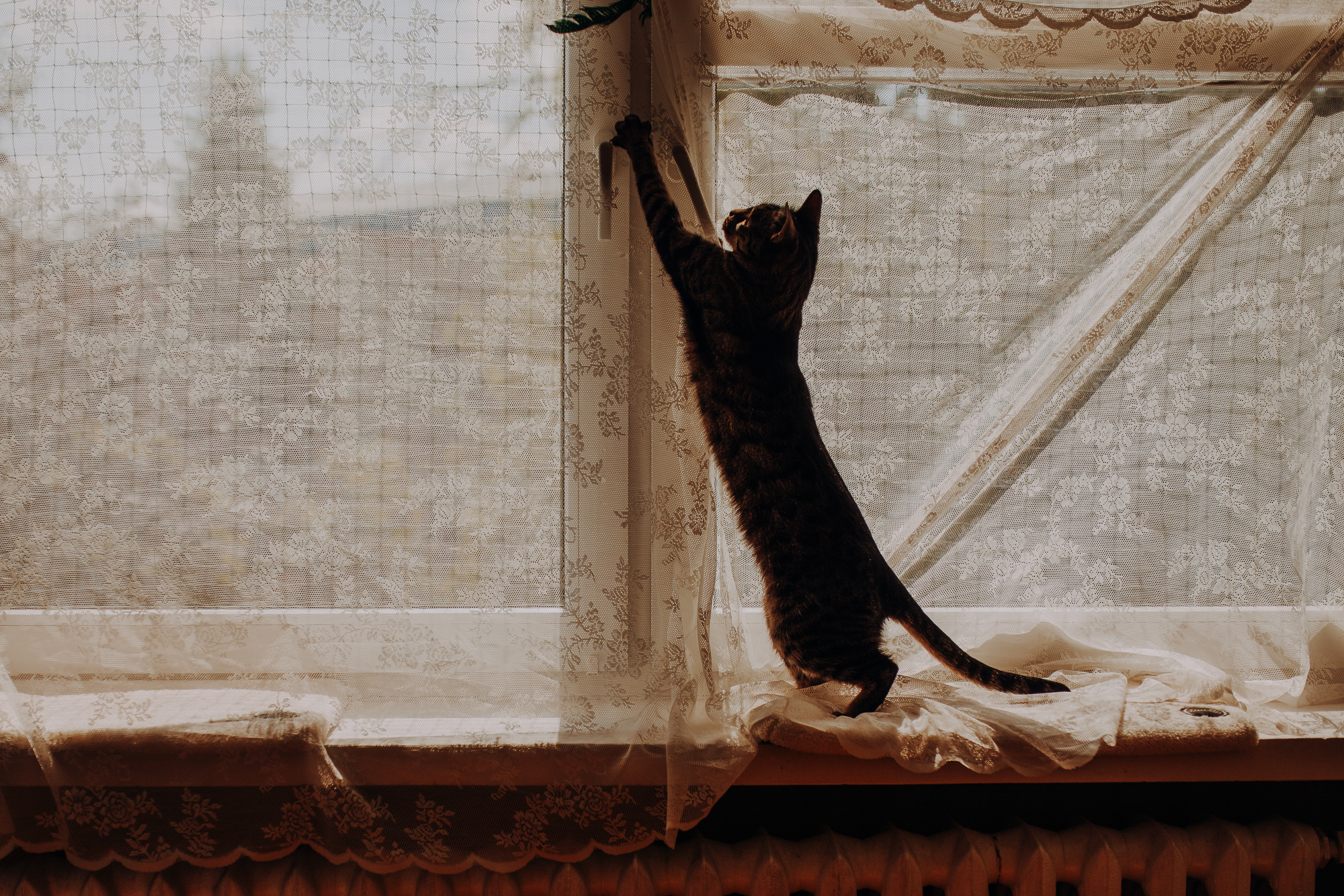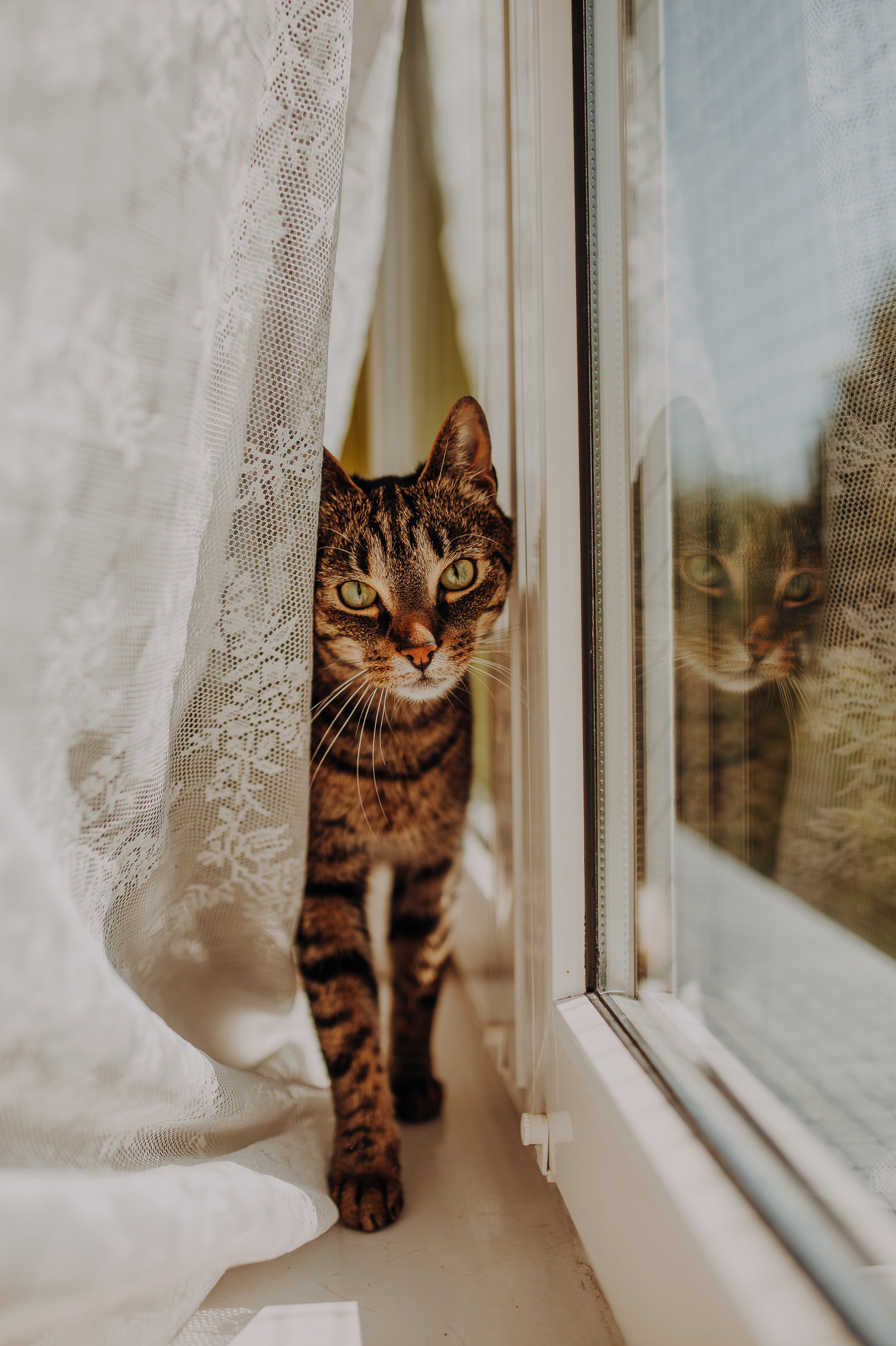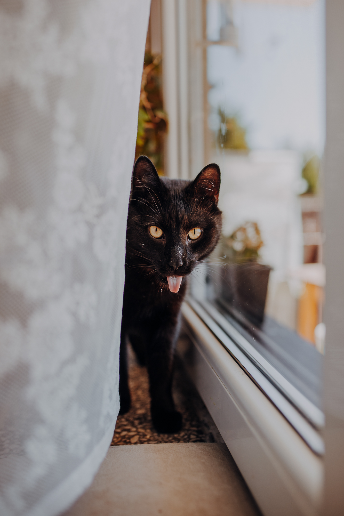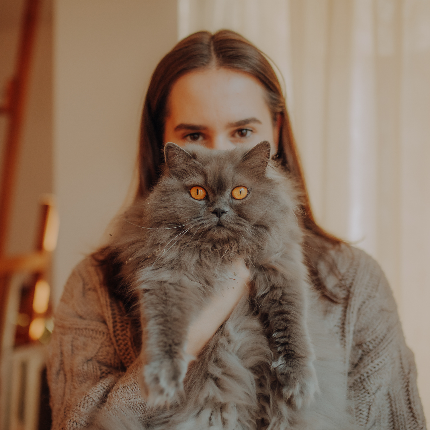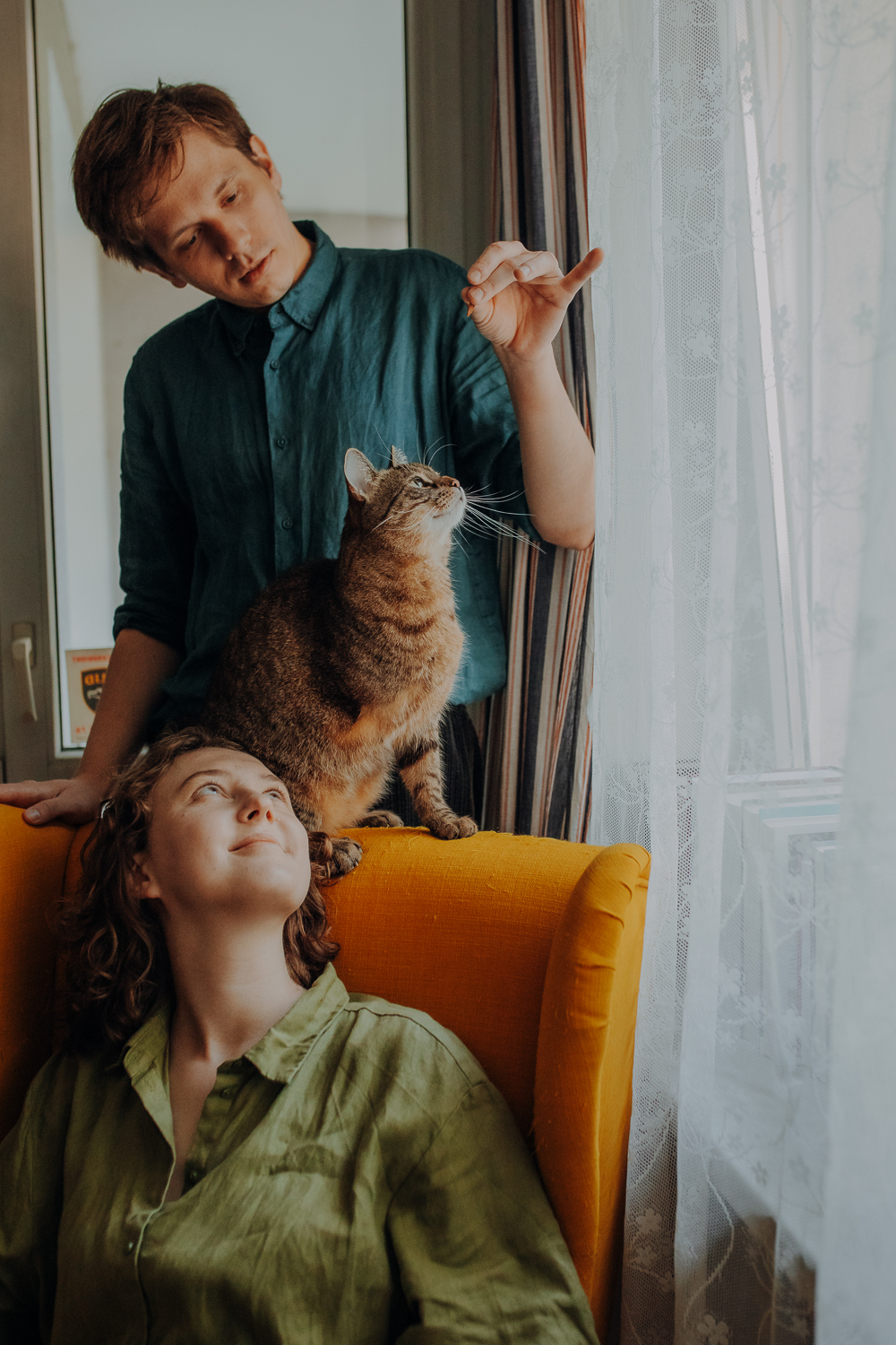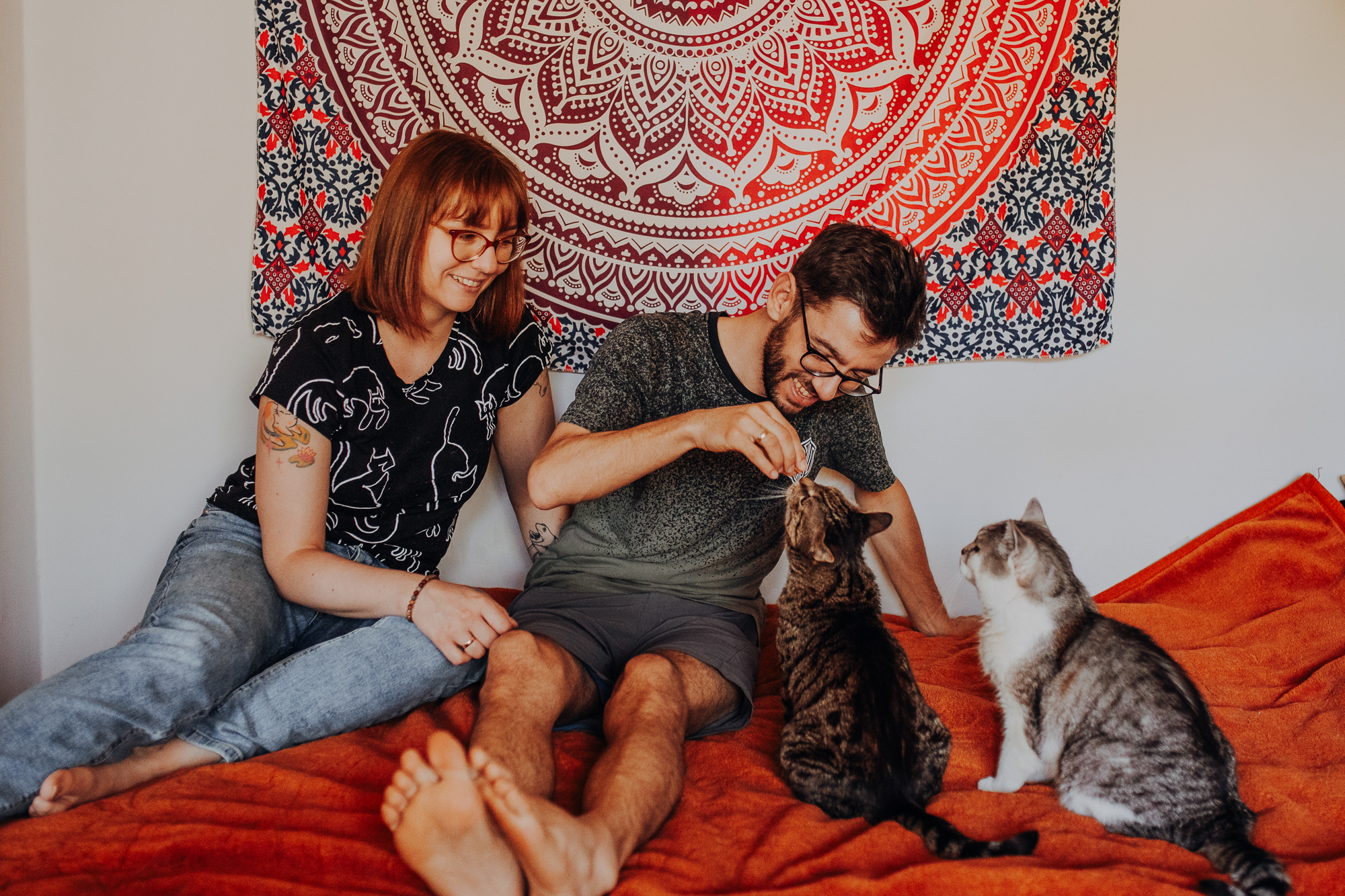 Magda mnie uprzedziła, że Leoś początkowo może mną wzgardzić, a Bonaparte przyglądać mi się jedynie z boku i obserwować, czy w ogóle opłaca mu się do mnie podejść. Na szczęście miałam ze sobą MAGICZNE PIÓRKA które bardzo szybko przekonały wszystkie koty do współpracy. Magisterka, która wyszła już do mnie na samym początku - żeby obwąchać moją torbę też była zainteresowana nową zabawką. Zdjęcia z wędką robiłyśmy głównie na hamaku, więc kotki mogły poczuć się jak prawdziwe tarzany, gdy wspinały się po jego niestabilnej konstrukcji.