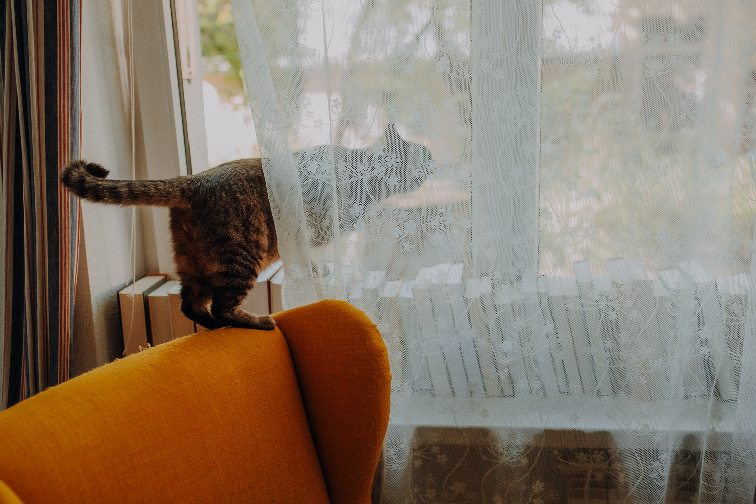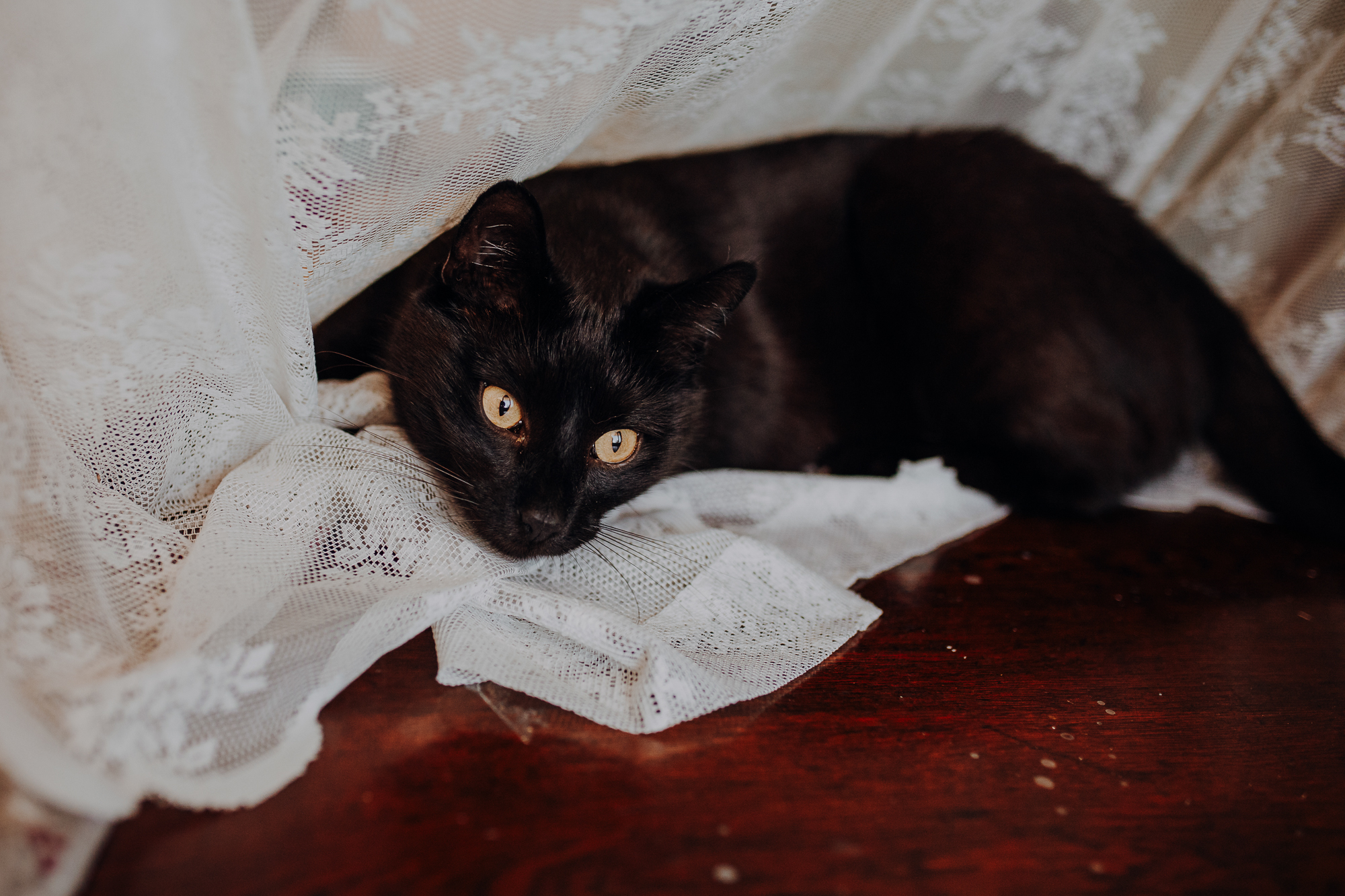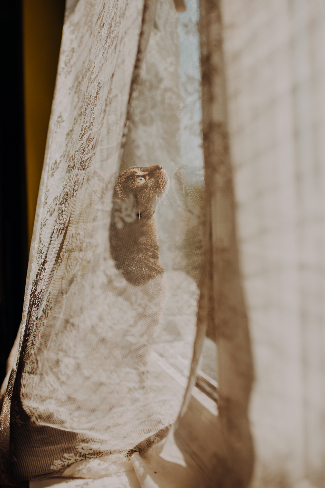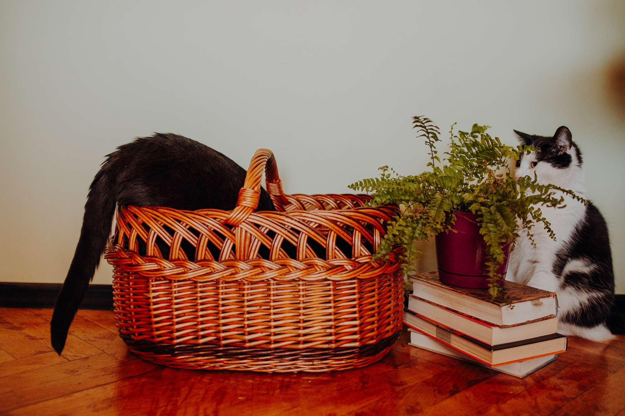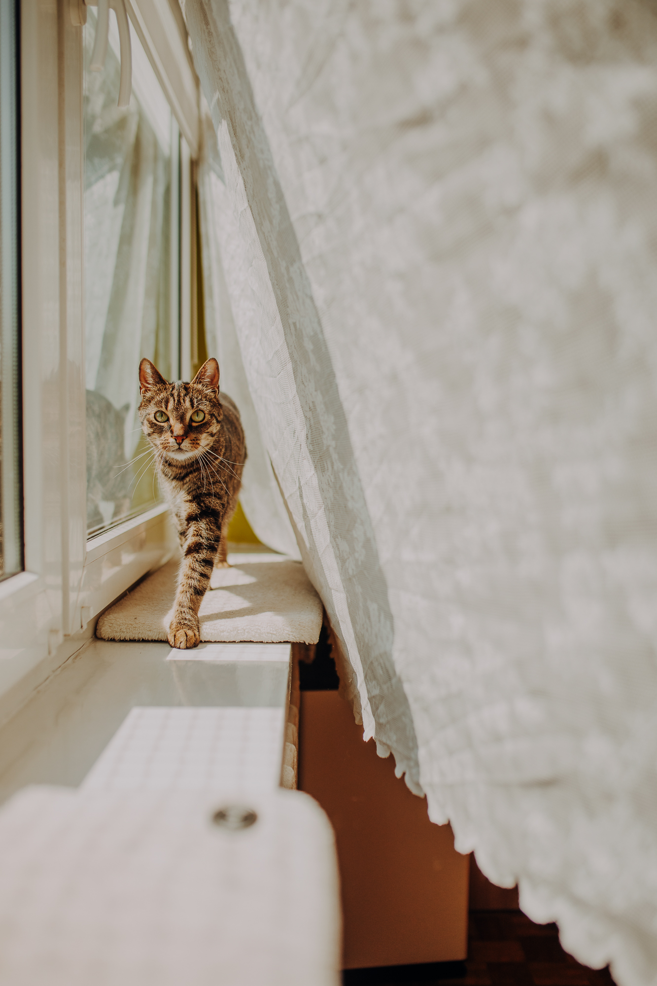 Magda mnie uprzedziła, że Leoś początkowo może mną wzgardzić, a Bonaparte przyglądać mi się jedynie z boku i obserwować, czy w ogóle opłaca mu się do mnie podejść. Na szczęście miałam ze sobą MAGICZNE PIÓRKA które bardzo szybko przekonały wszystkie koty do współpracy. Magisterka, która wyszła już do mnie na samym początku - żeby obwąchać moją torbę też była zainteresowana nową zabawką. Zdjęcia z wędką robiłyśmy głównie na hamaku, więc kotki mogły poczuć się jak prawdziwe tarzany, gdy wspinały się po jego niestabilnej konstrukcji.
