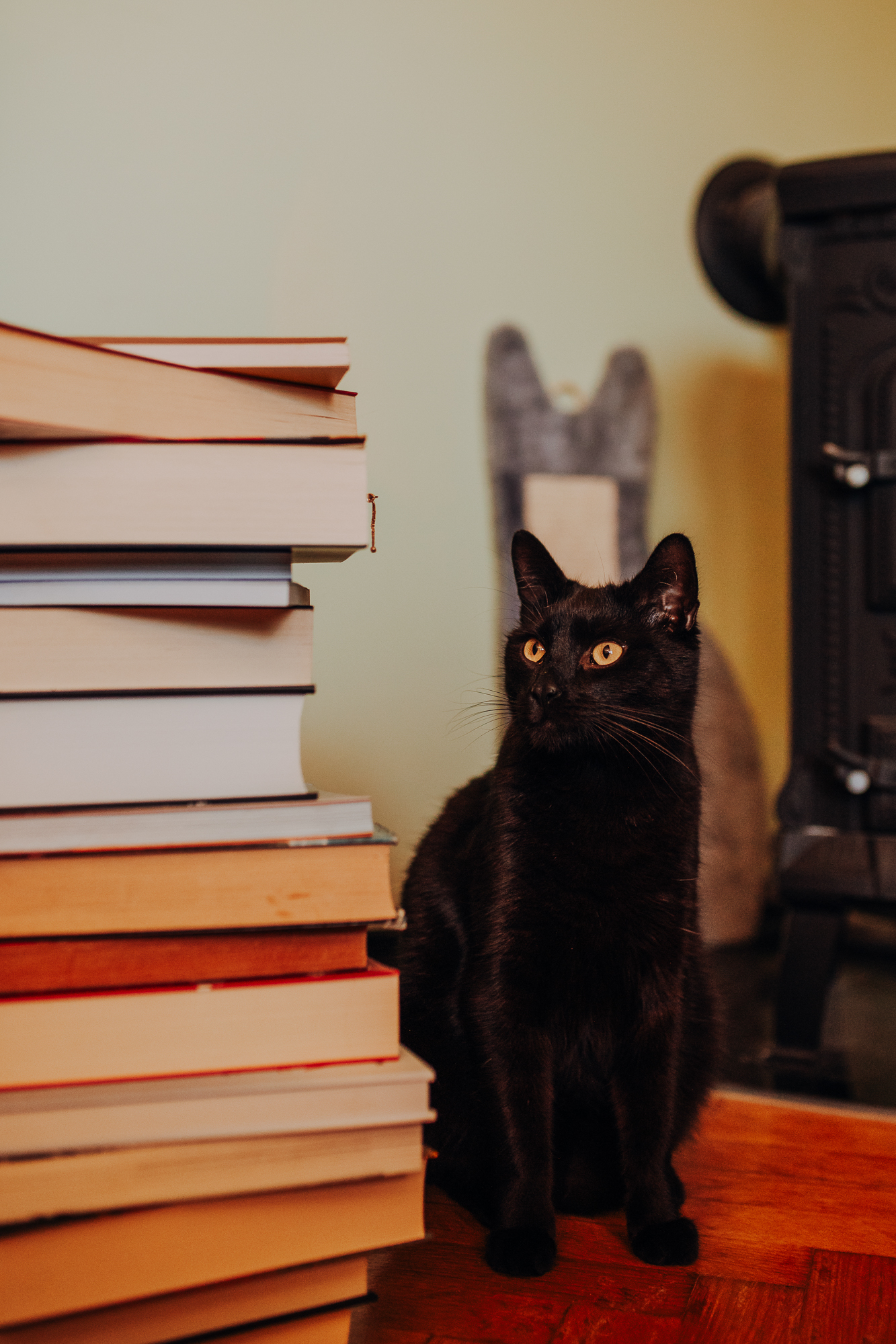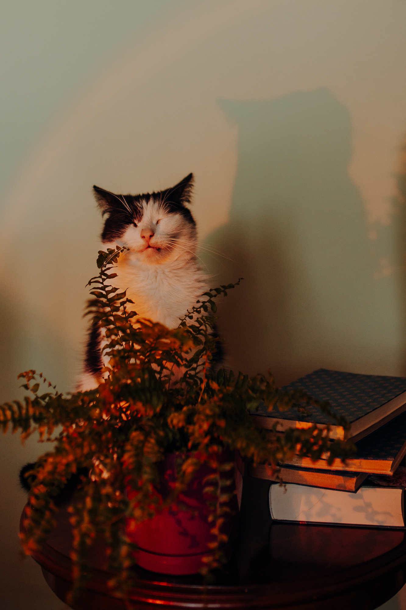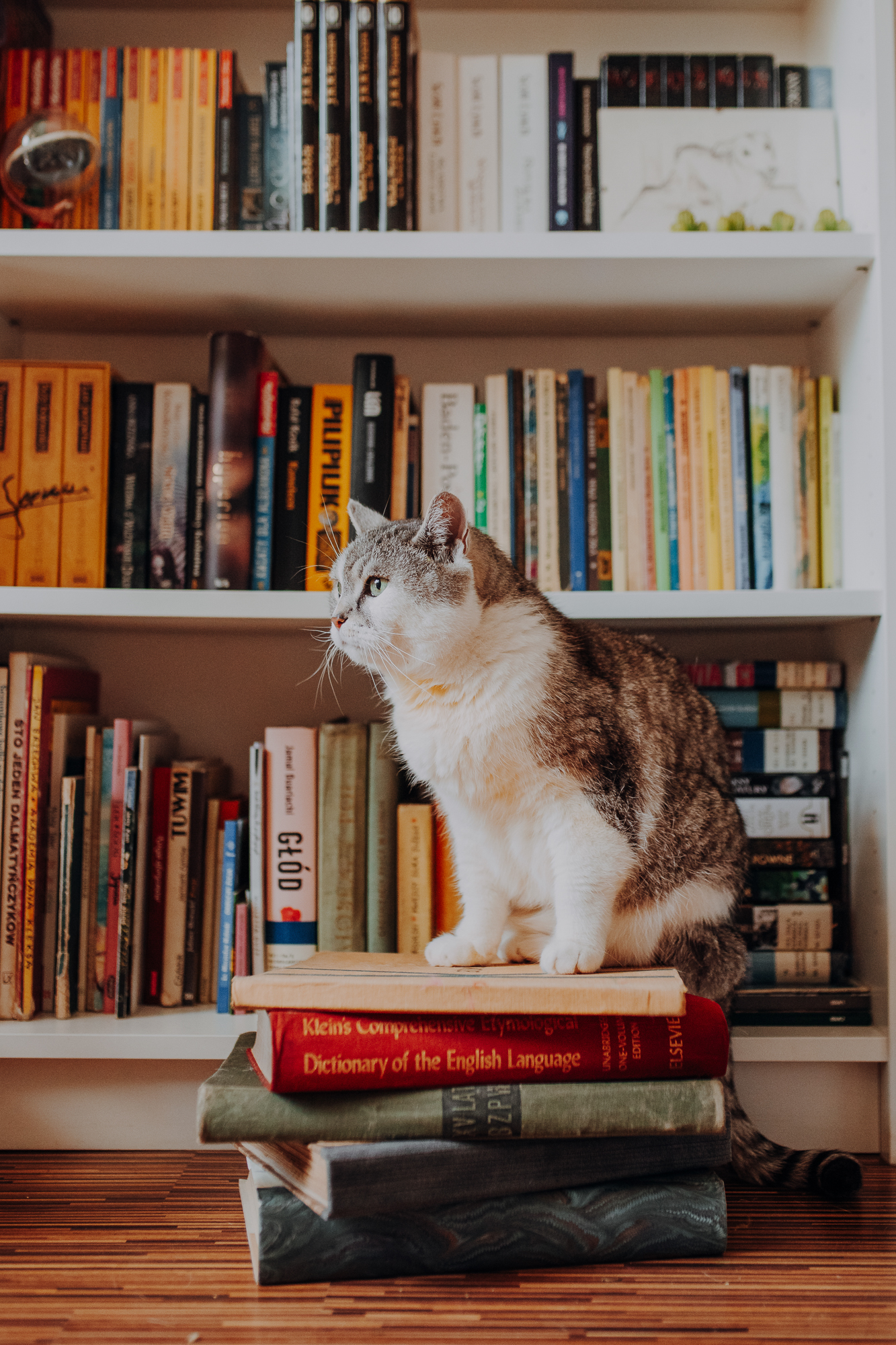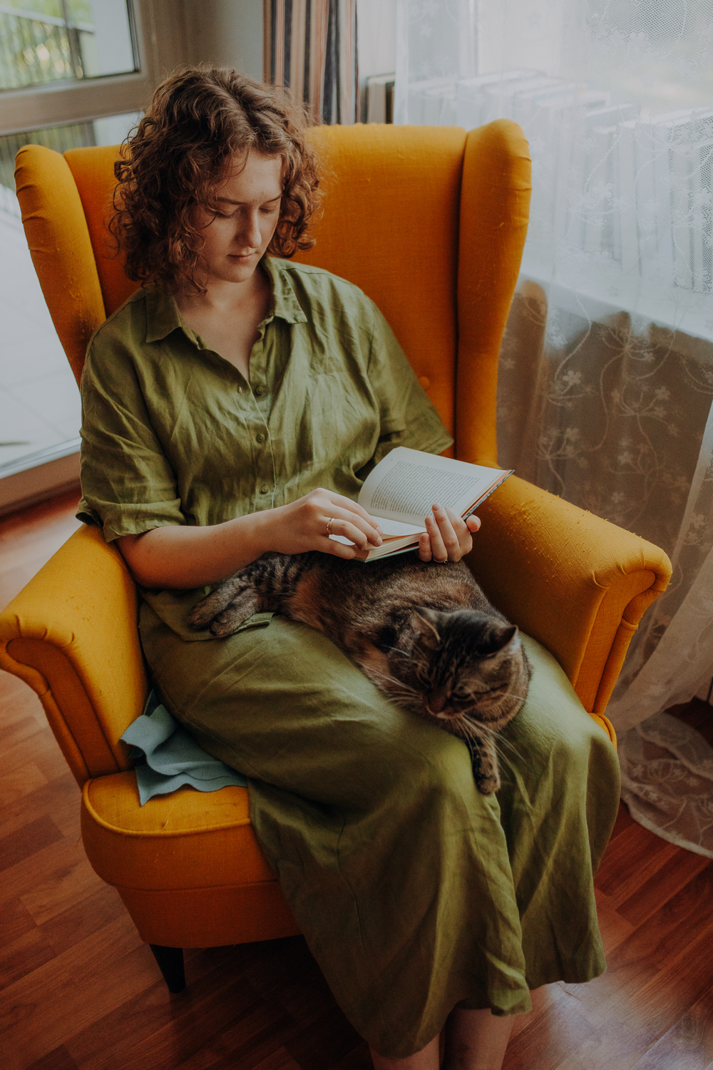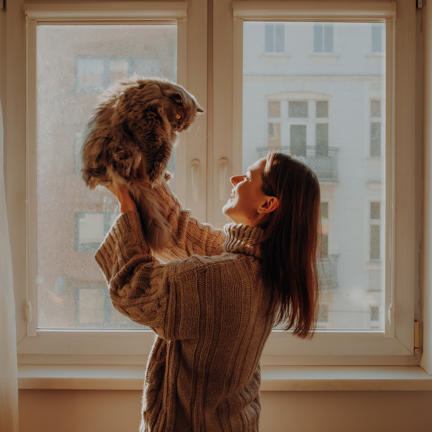 Magda mnie uprzedziła, że Leoś początkowo może mną wzgardzić, a Bonaparte przyglądać mi się jedynie z boku i obserwować, czy w ogóle opłaca mu się do mnie podejść. Na szczęście miałam ze sobą MAGICZNE PIÓRKA które bardzo szybko przekonały wszystkie koty do współpracy. Magisterka, która wyszła już do mnie na samym początku - żeby obwąchać moją torbę też była zainteresowana nową zabawką. Zdjęcia z wędką robiłyśmy głównie na hamaku, więc kotki mogły poczuć się jak prawdziwe tarzany, gdy wspinały się po jego niestabilnej konstrukcji.