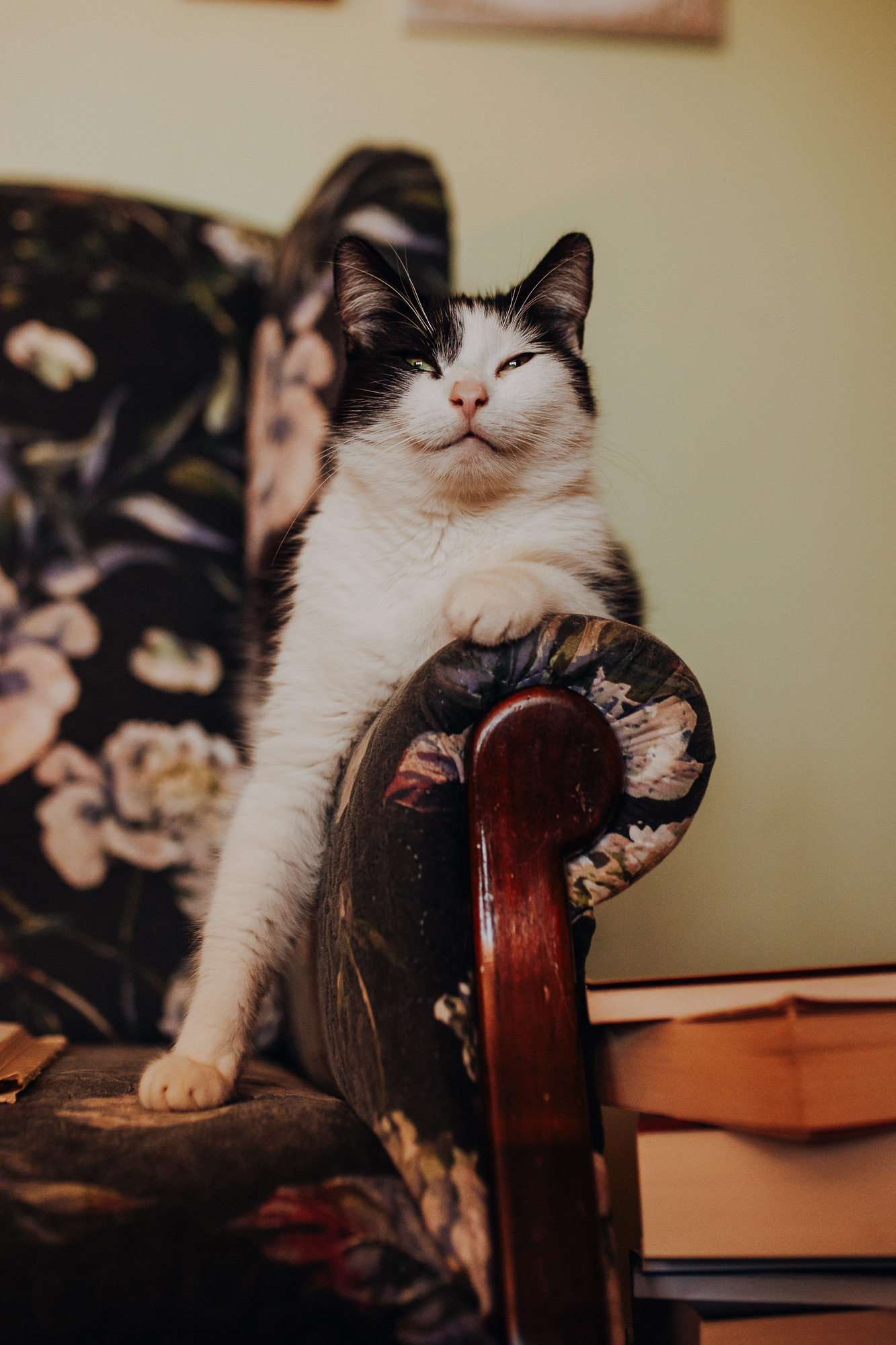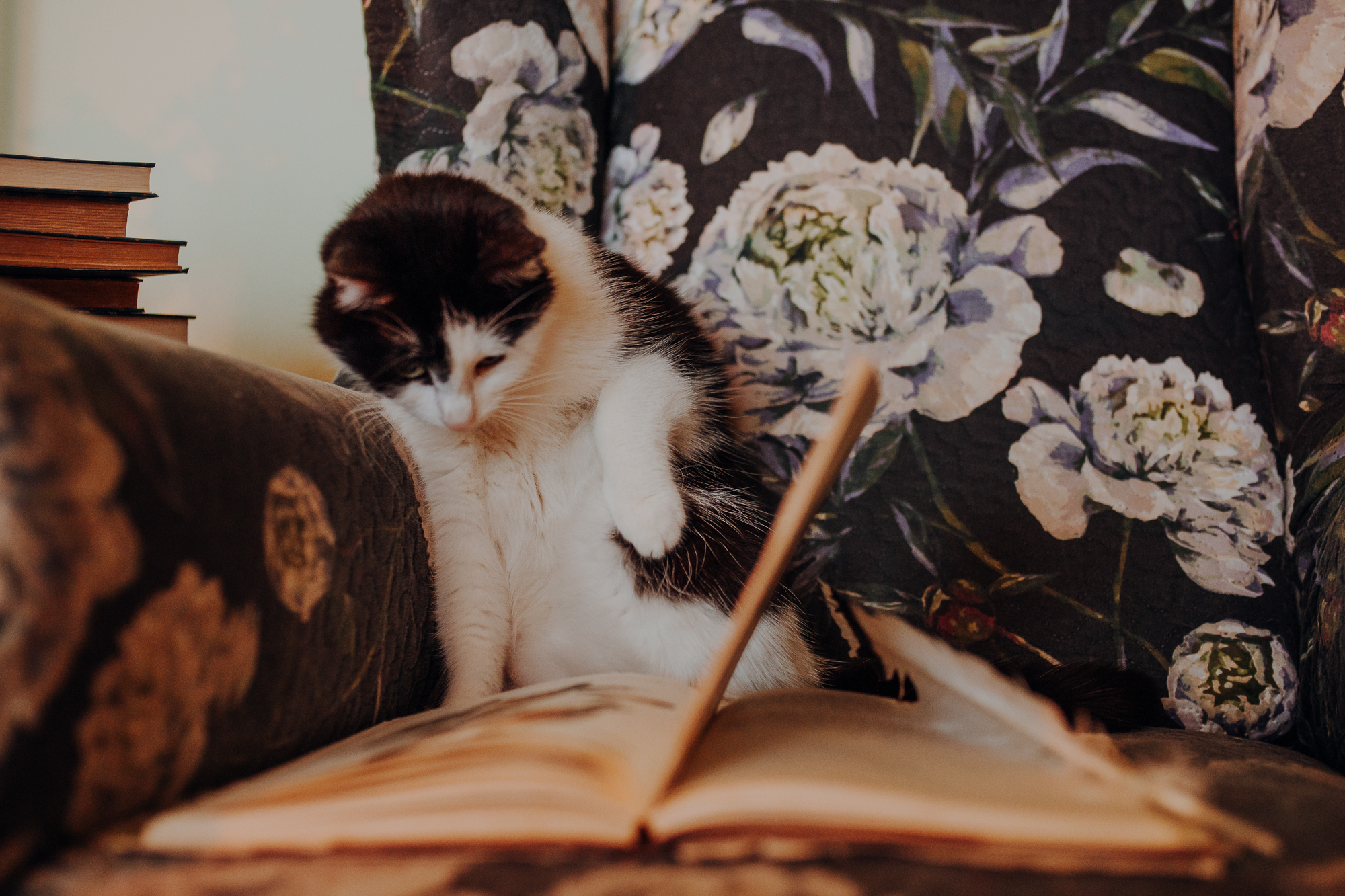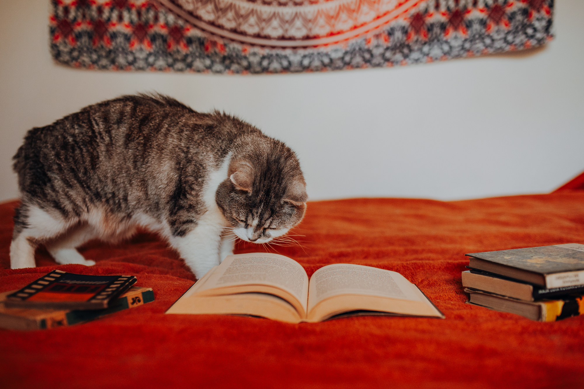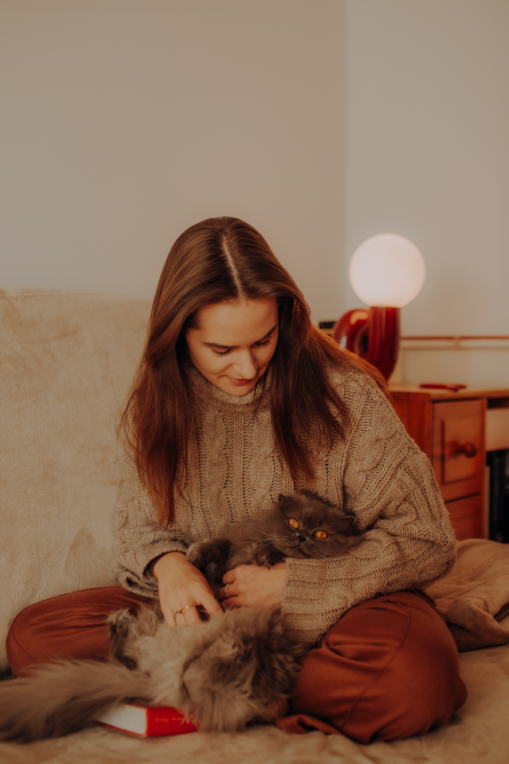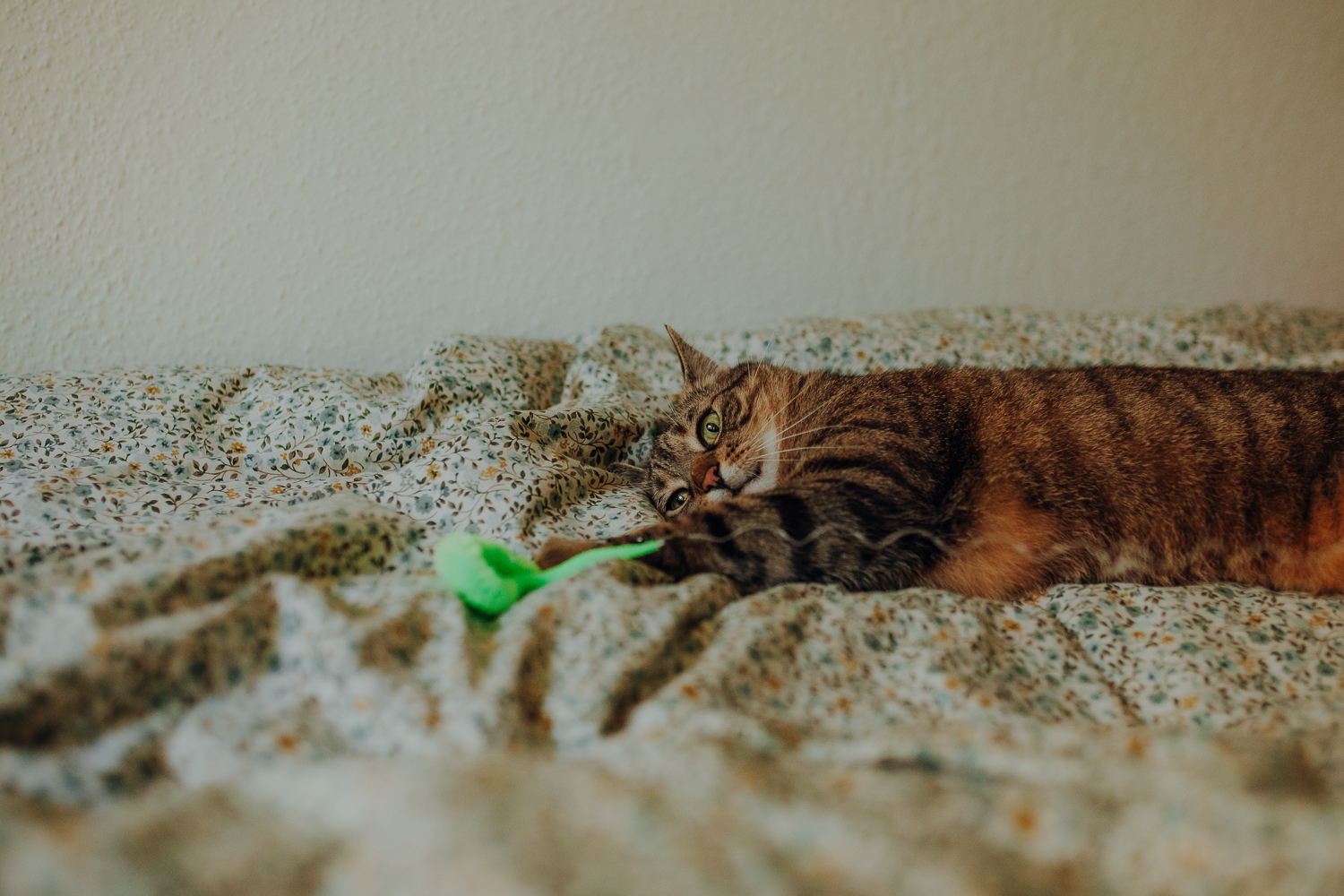 Magda mnie uprzedziła, że Leoś początkowo może mną wzgardzić, a Bonaparte przyglądać mi się jedynie z boku i obserwować, czy w ogóle opłaca mu się do mnie podejść. Na szczęście miałam ze sobą MAGICZNE PIÓRKA które bardzo szybko przekonały wszystkie koty do współpracy. Magisterka, która wyszła już do mnie na samym początku - żeby obwąchać moją torbę też była zainteresowana nową zabawką. Zdjęcia z wędką robiłyśmy głównie na hamaku, więc kotki mogły poczuć się jak prawdziwe tarzany, gdy wspinały się po jego niestabilnej konstrukcji.