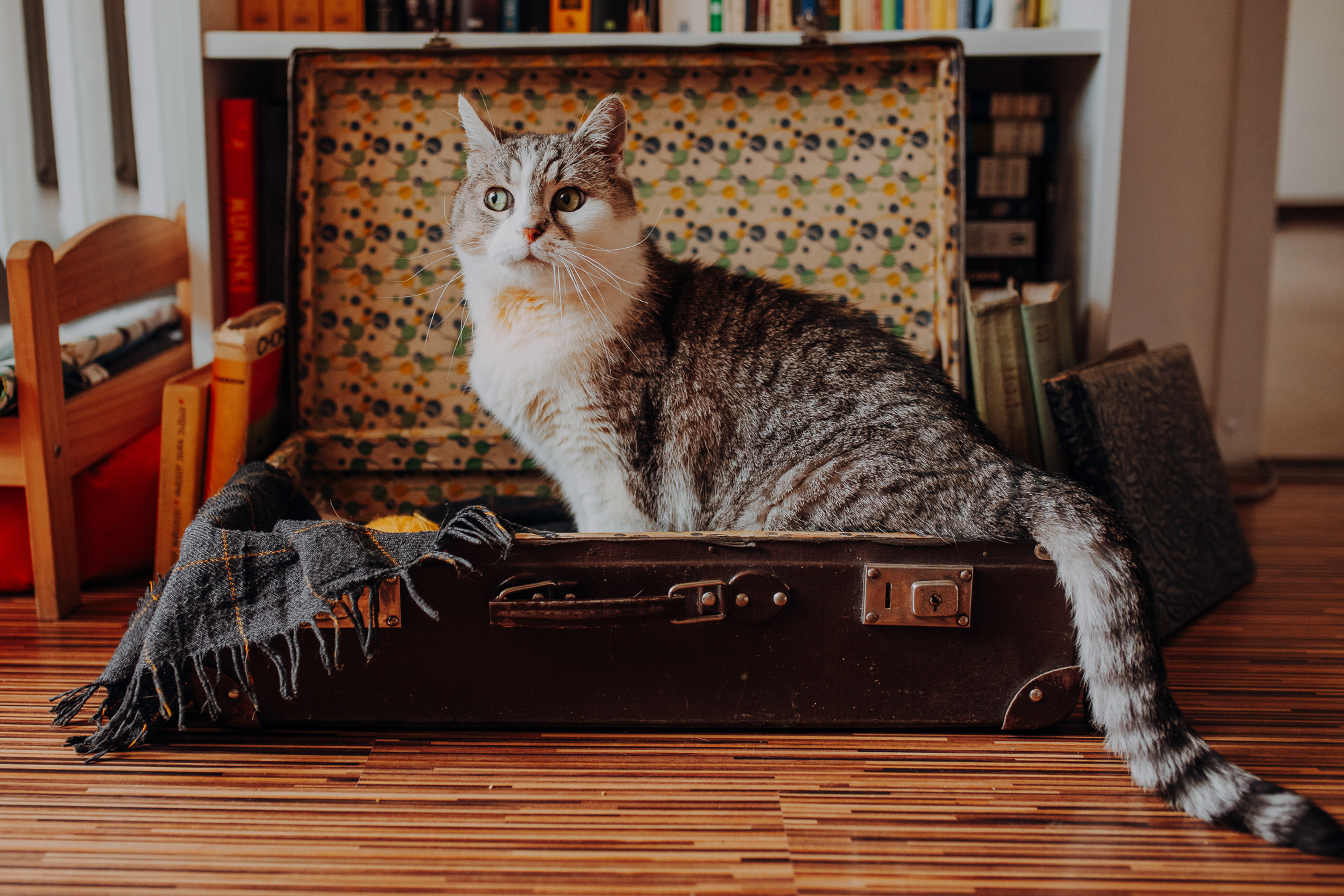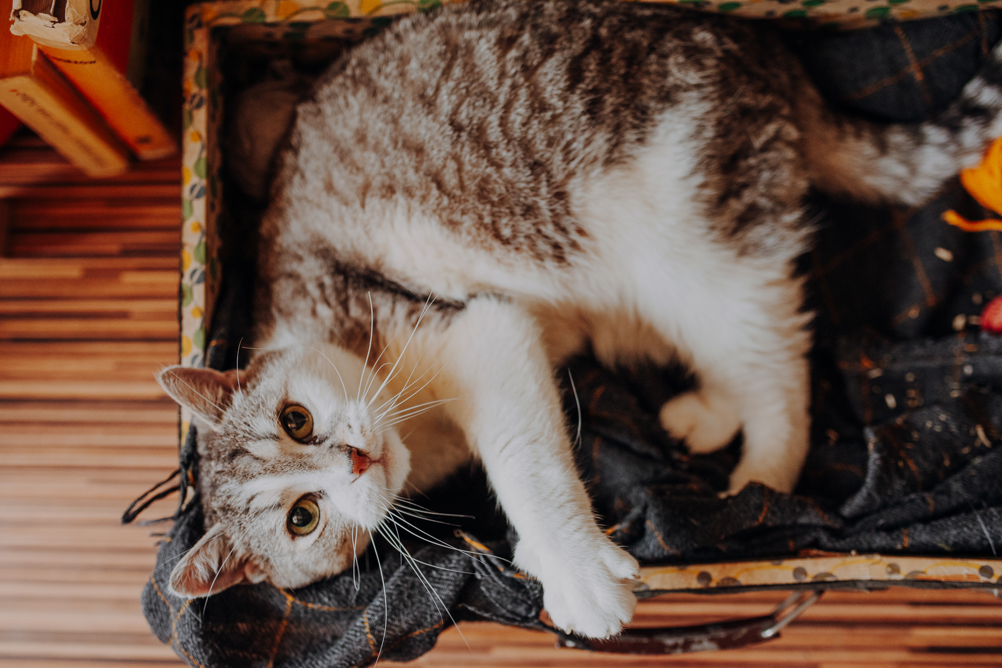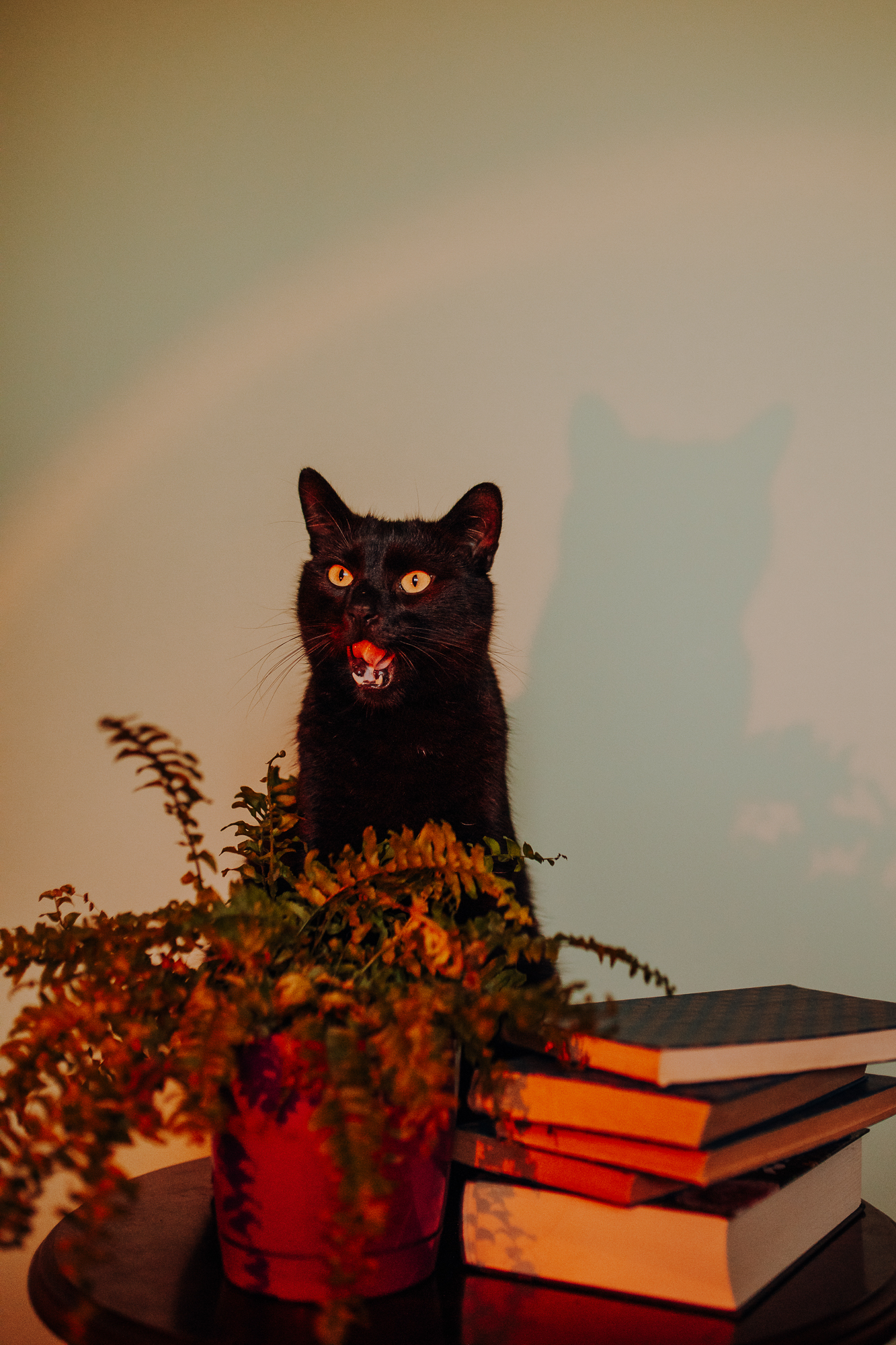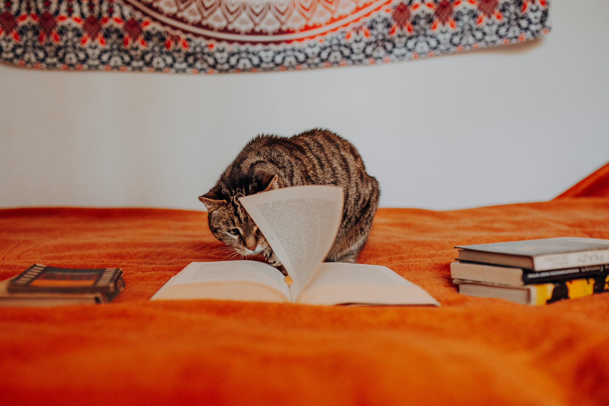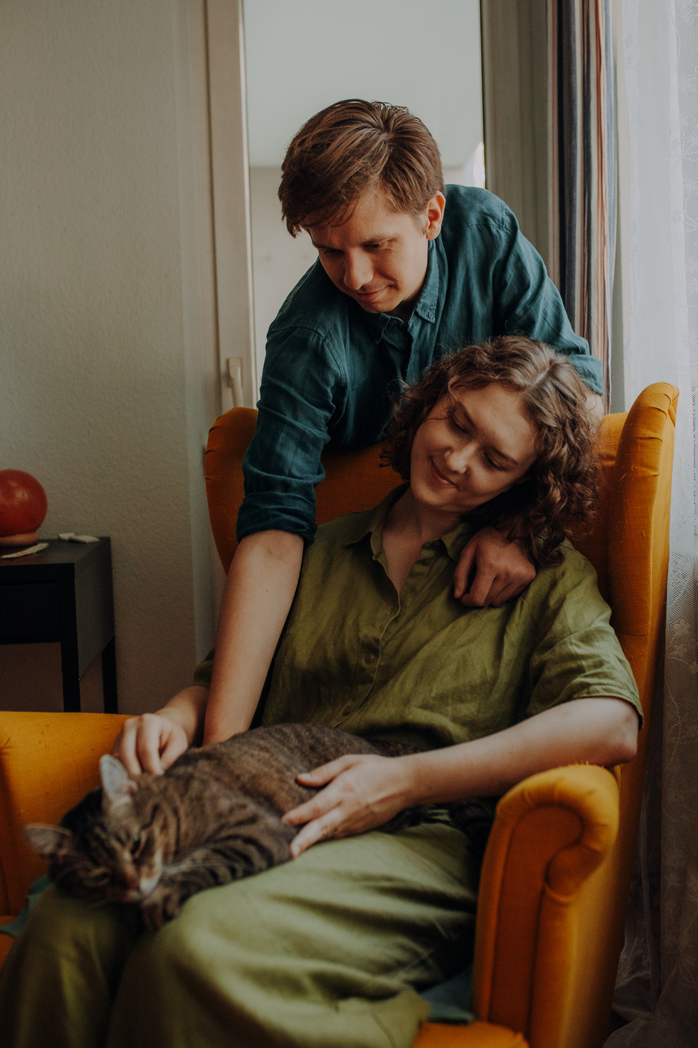 Magda mnie uprzedziła, że Leoś początkowo może mną wzgardzić, a Bonaparte przyglądać mi się jedynie z boku i obserwować, czy w ogóle opłaca mu się do mnie podejść. Na szczęście miałam ze sobą MAGICZNE PIÓRKA które bardzo szybko przekonały wszystkie koty do współpracy. Magisterka, która wyszła już do mnie na samym początku - żeby obwąchać moją torbę też była zainteresowana nową zabawką. Zdjęcia z wędką robiłyśmy głównie na hamaku, więc kotki mogły poczuć się jak prawdziwe tarzany, gdy wspinały się po jego niestabilnej konstrukcji.