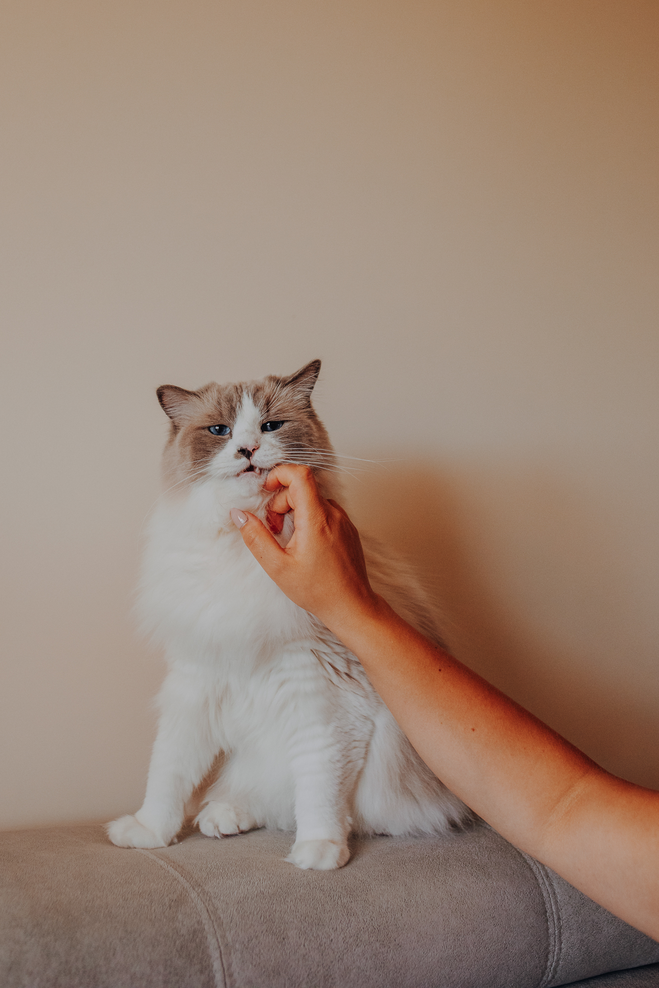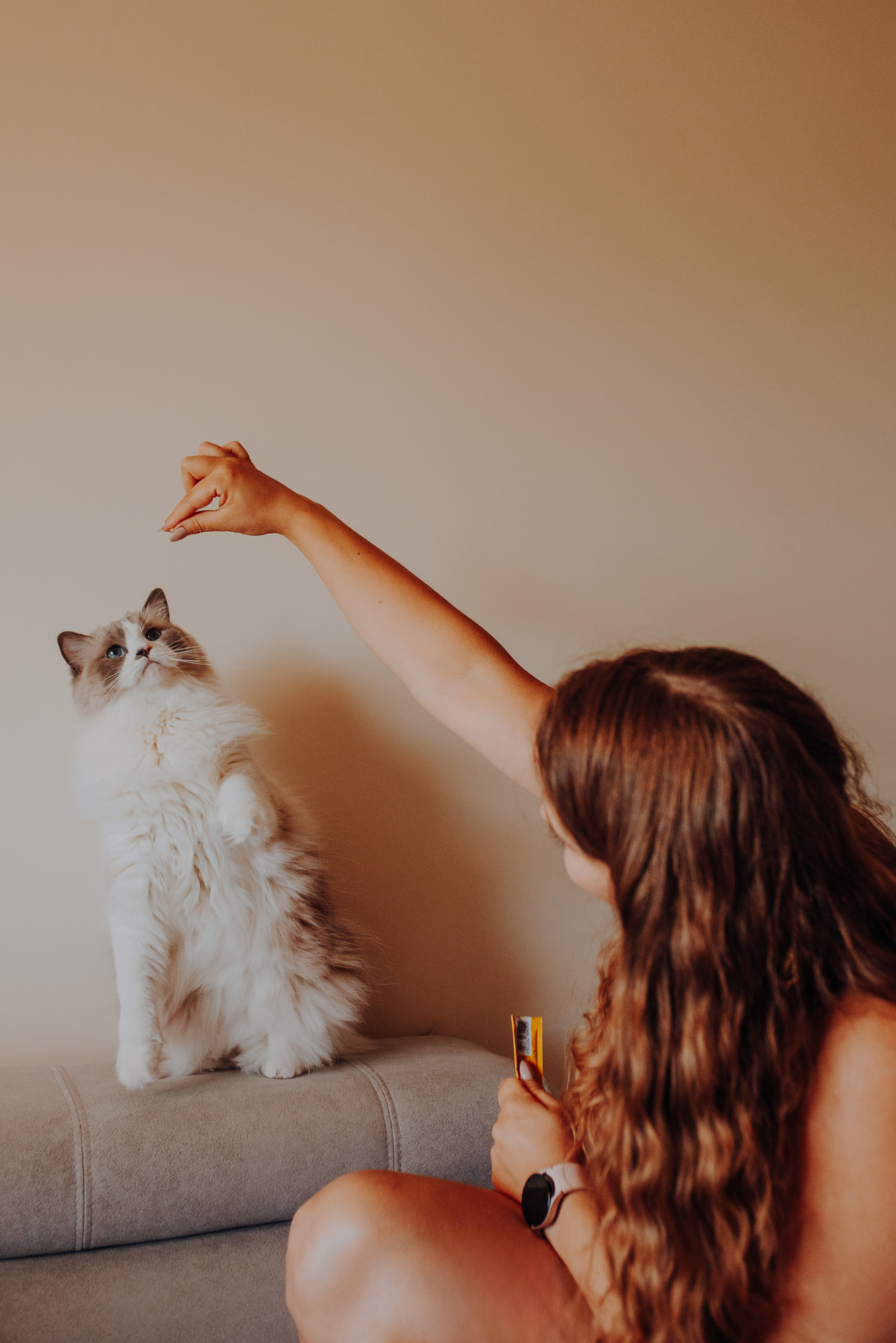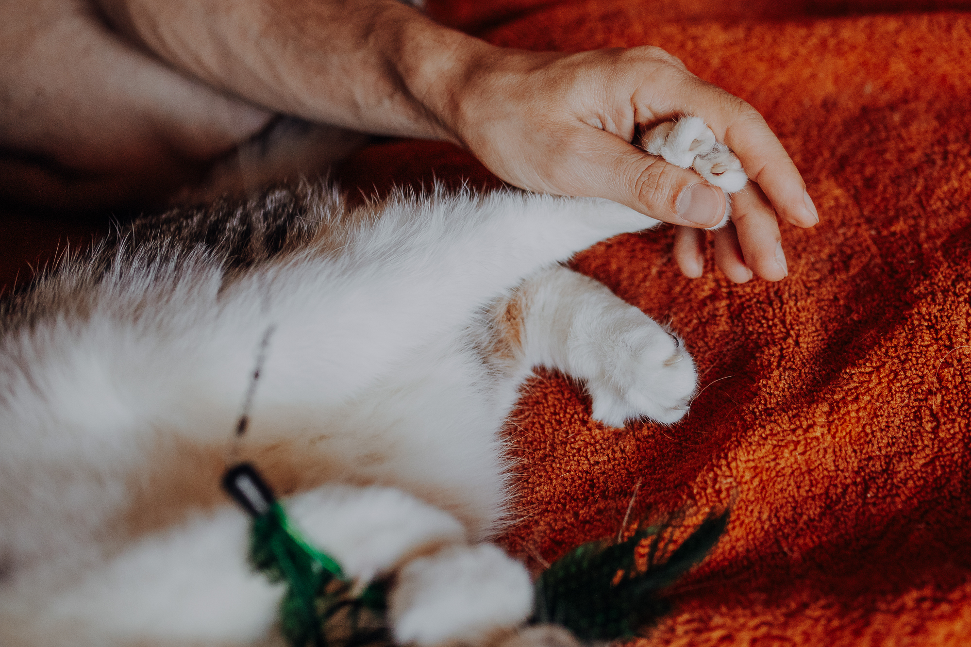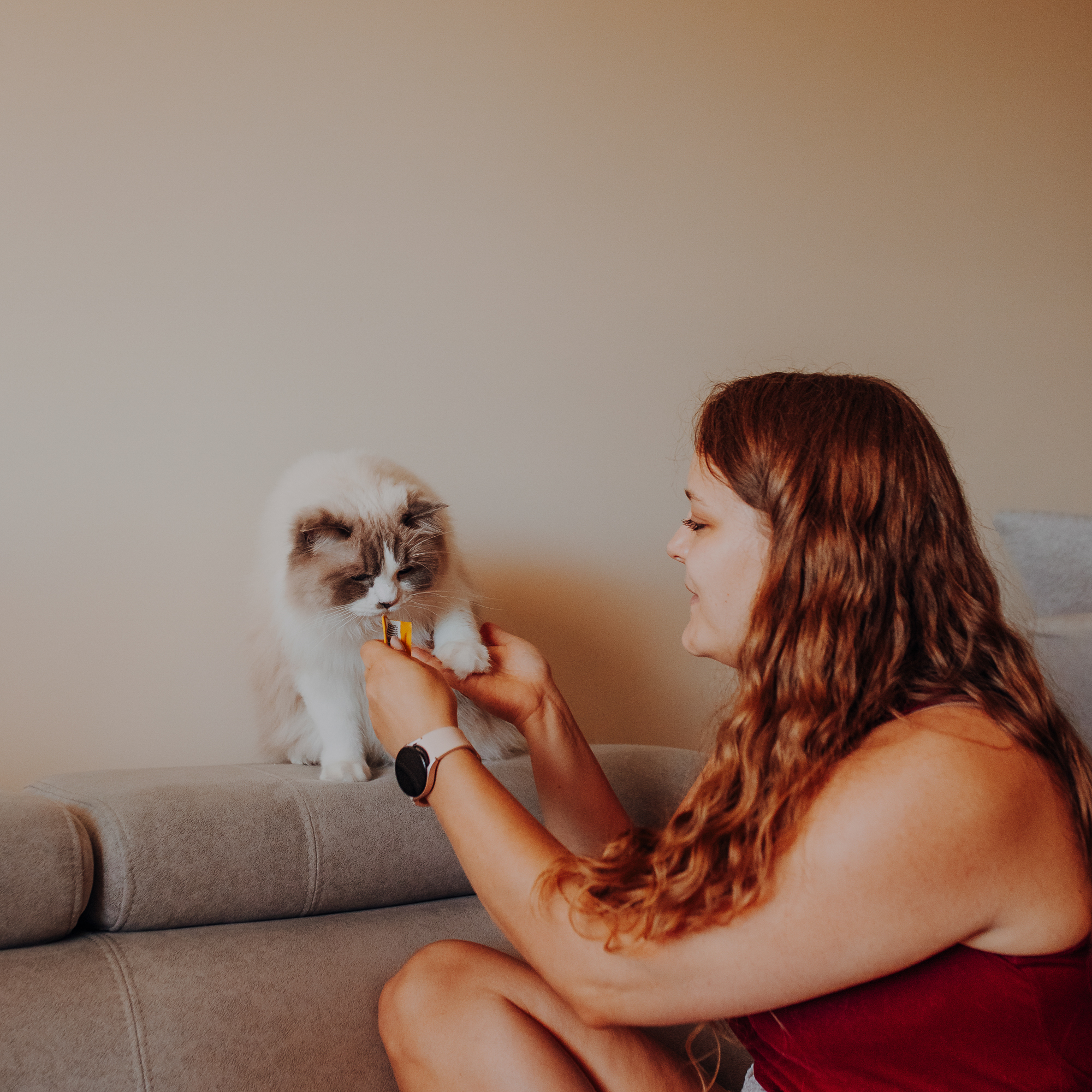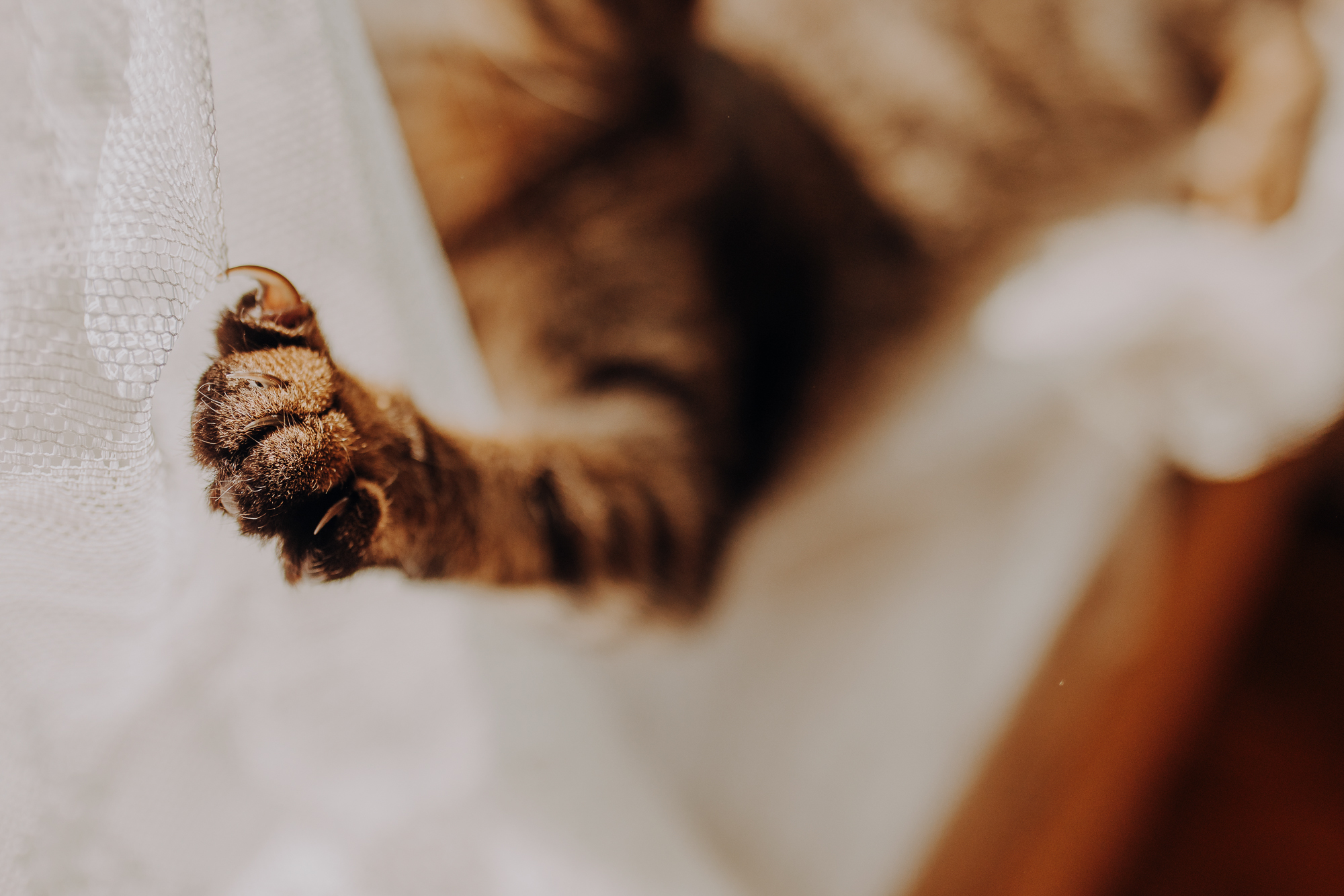 Na sesji u mnie często jest tak, że do pomocy mamy dużo rekwizytów. A to piórka długie, a to krótkie, a to cosma, a to... pasta.. I cóż czasami można się pogubić w tej ilości dobroci dla kotków. Byłyśmy w trakcie robienia wspólnych przytulankowych zdjęć na hamaku, gdy Magda zorientowała się, że nie ma pasty. Okazało się, że... na niej usiadła. Czasami takie rzeczy się u mnie zdarzają, czasami też śmieje się, że podczas sesji oznaczam wszystko pastą. A to tutaj spadnie kropelka, a to tam. Wiem, że to może brzmieć jak antyreklama, ale tak po prostu jest :D Przy pracy z kotami naprawdę ciężko jest wyjść z tego czystym, czy nie podrapanym, a już na pewno niemożliwe jest wyjście niezakłaczonym. ;D
